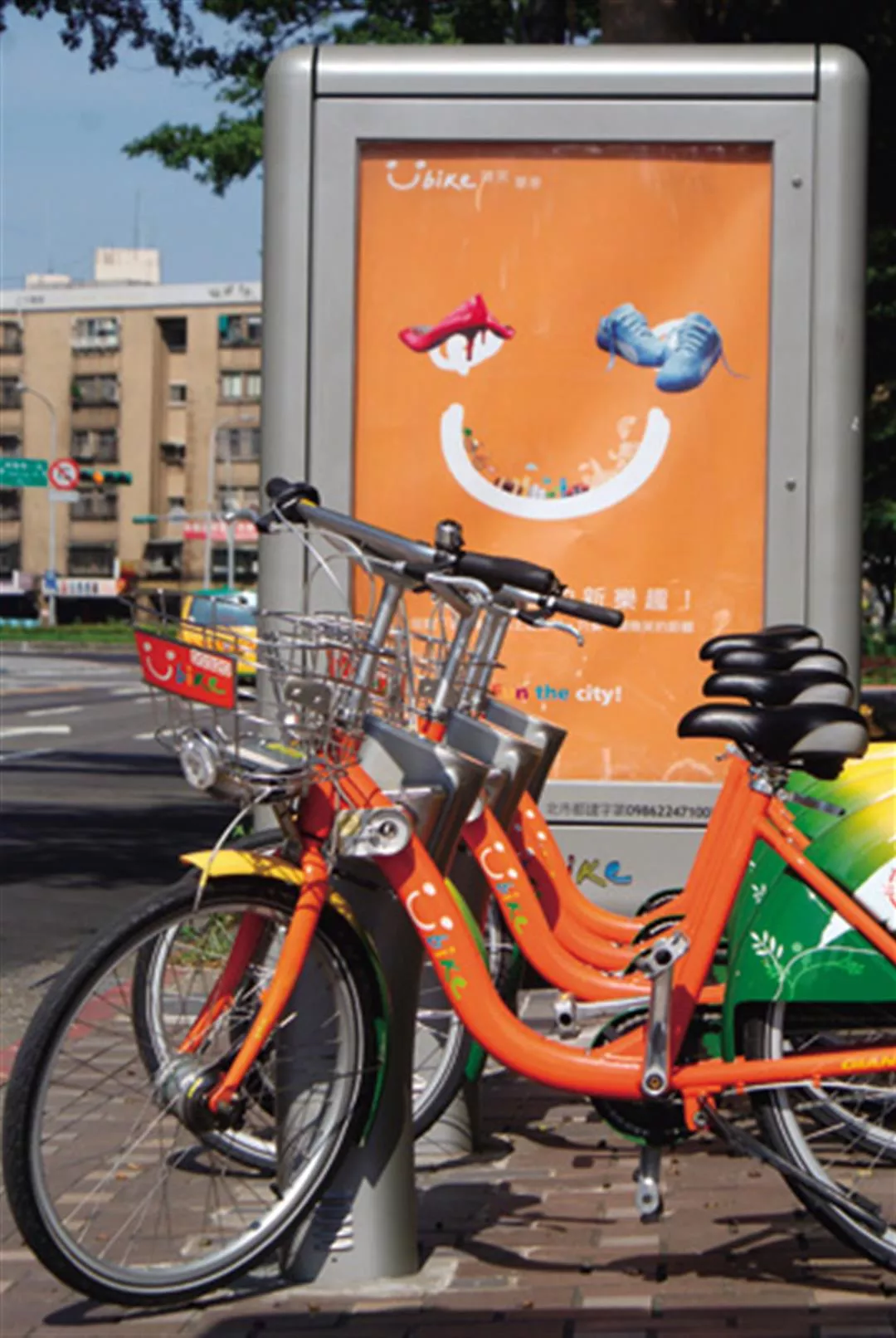 目前在北市信義區內的10個租借站,看得到一款款鮮橘色、低跨點設計的租賃自行車,是巨大與市府合作的接駁型公共自行車租賃系統,提供約500輛供民眾使用。