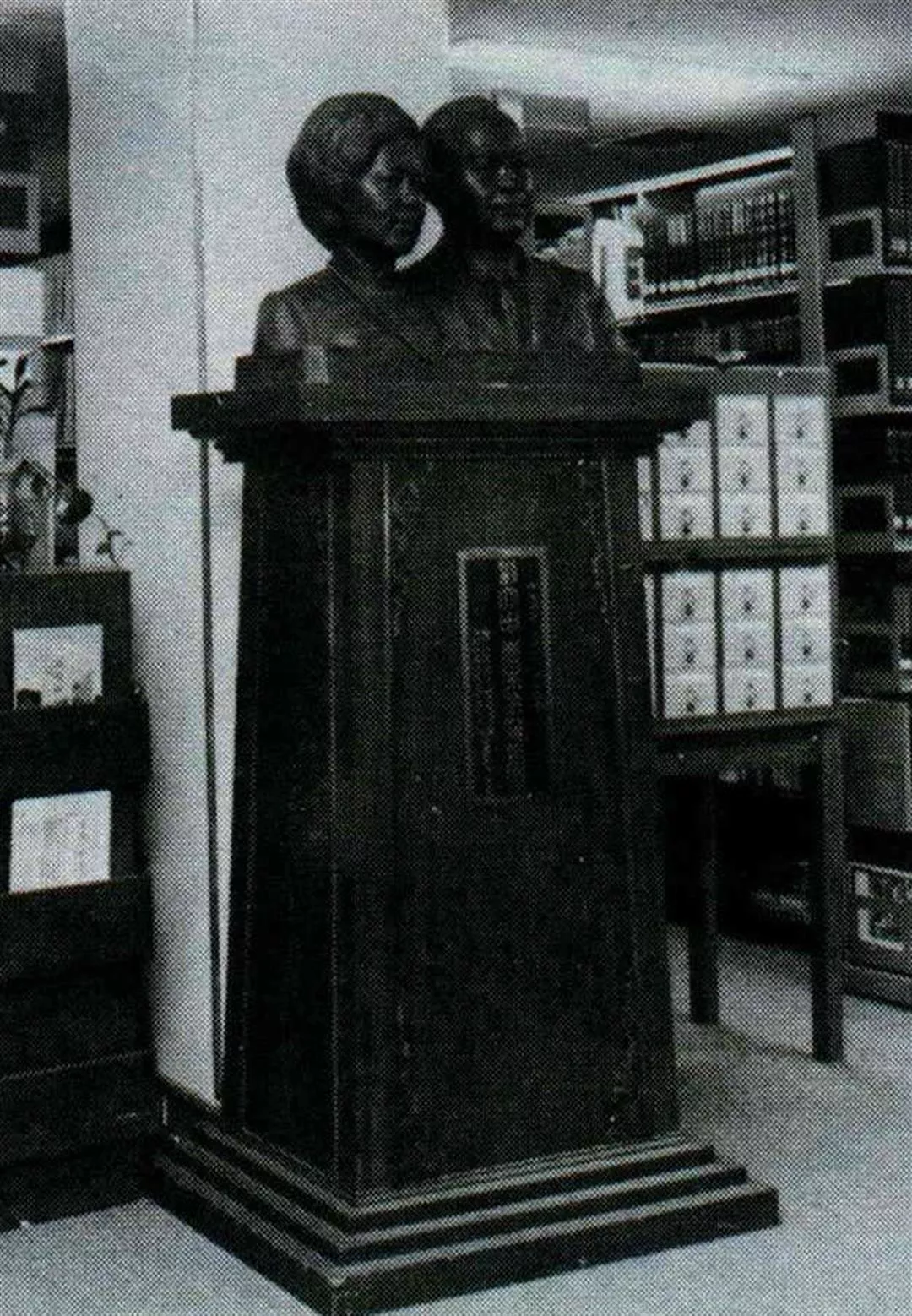 圖:台經所圖書館的圖書有許多是劉大中伉儷捐贈的,館中有他們的銅像,以資紀念。(李影)
