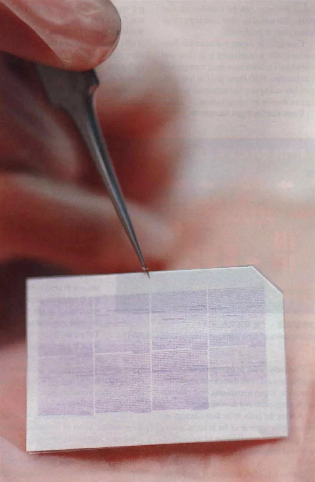大小如郵票的基因晶片上印有九千六百點基因,可以用來協助研究與檢測疾病,目前已有晶片公司開發出腸病毒晶片,提供醫院作臨床測試。(邱瑞金)