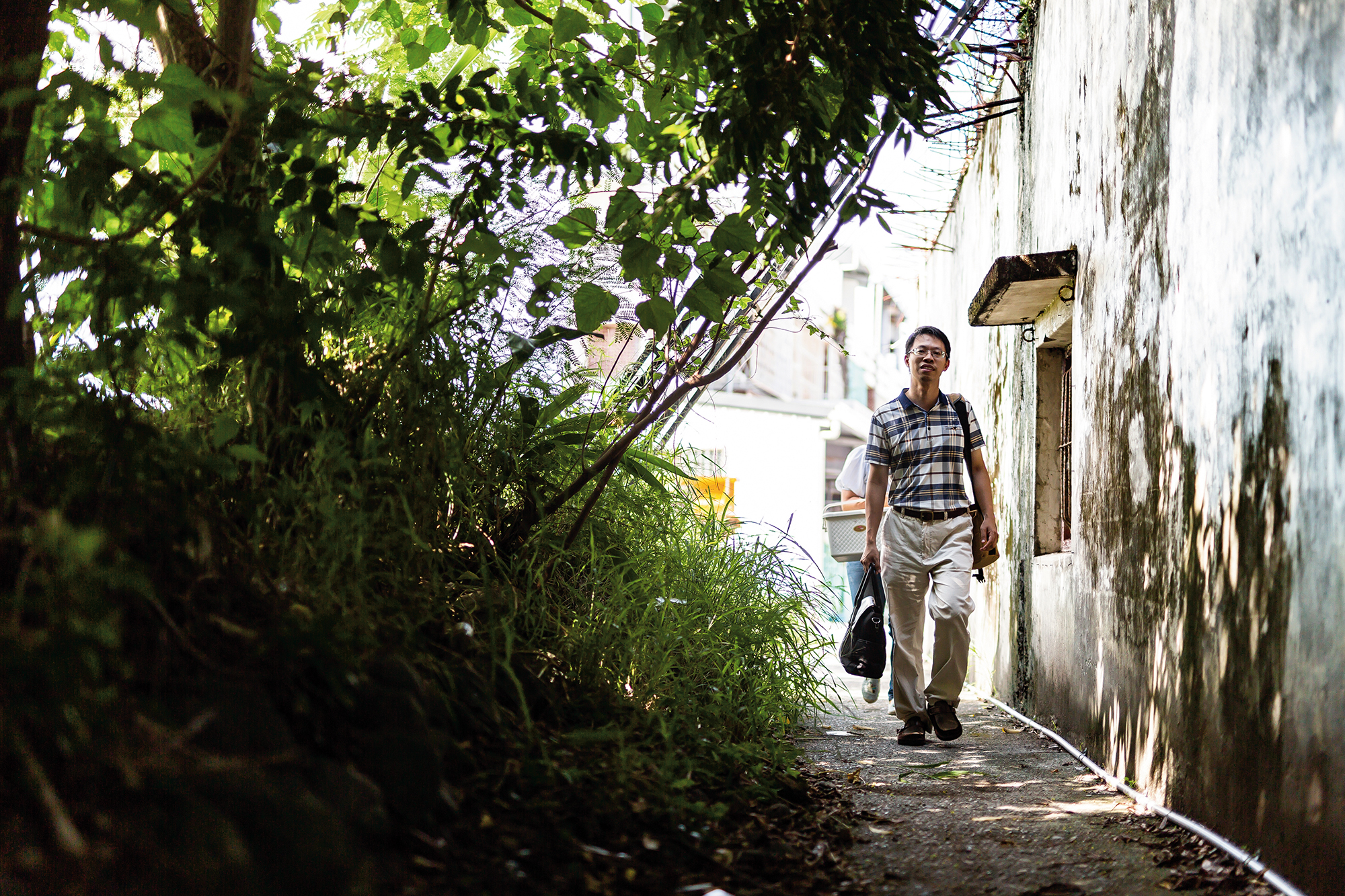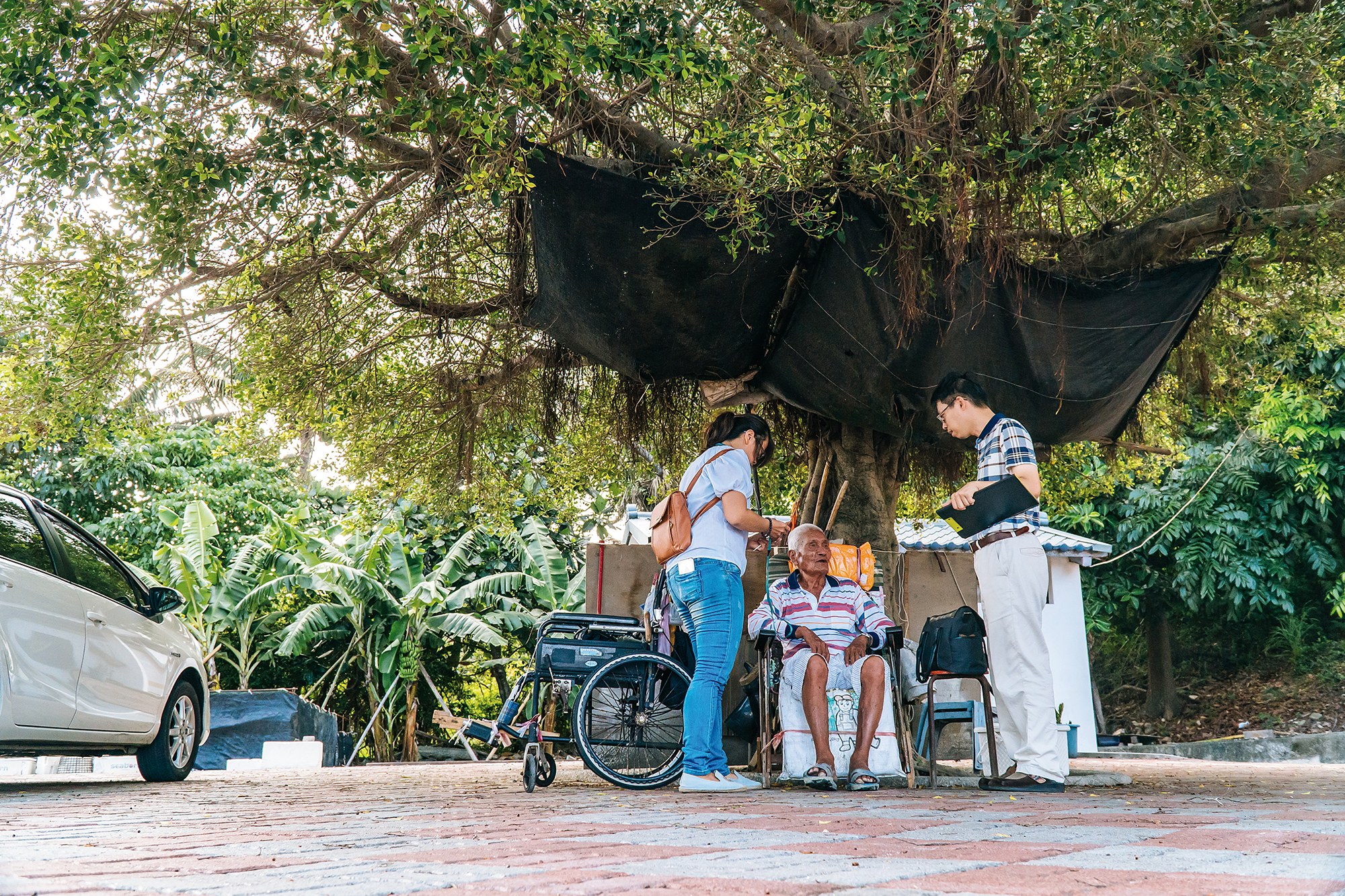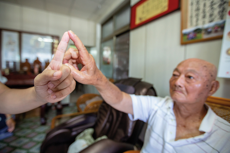 當一行人抵達公路旁的福安堂前,年邁的清泉(化名)正坐在榕樹綠蔭下納涼打盹,家毗鄰在旁的他,偌大的廟埕,好似自家的客廳。
