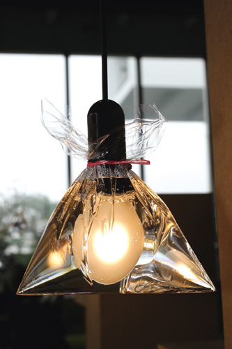 傳統市場蚊蠅滿天飛,小販們用一條繩子綁上「水袋」,或者聰明地把廢棄光碟較亮的那一面黏在牆上,運用「光反射」原理來驅趕蒼蠅。設計師將燈泡「泡」在裝滿水的特製塑膠袋裡,竟然不會觸電,還變成餐桌上的美美吊燈。