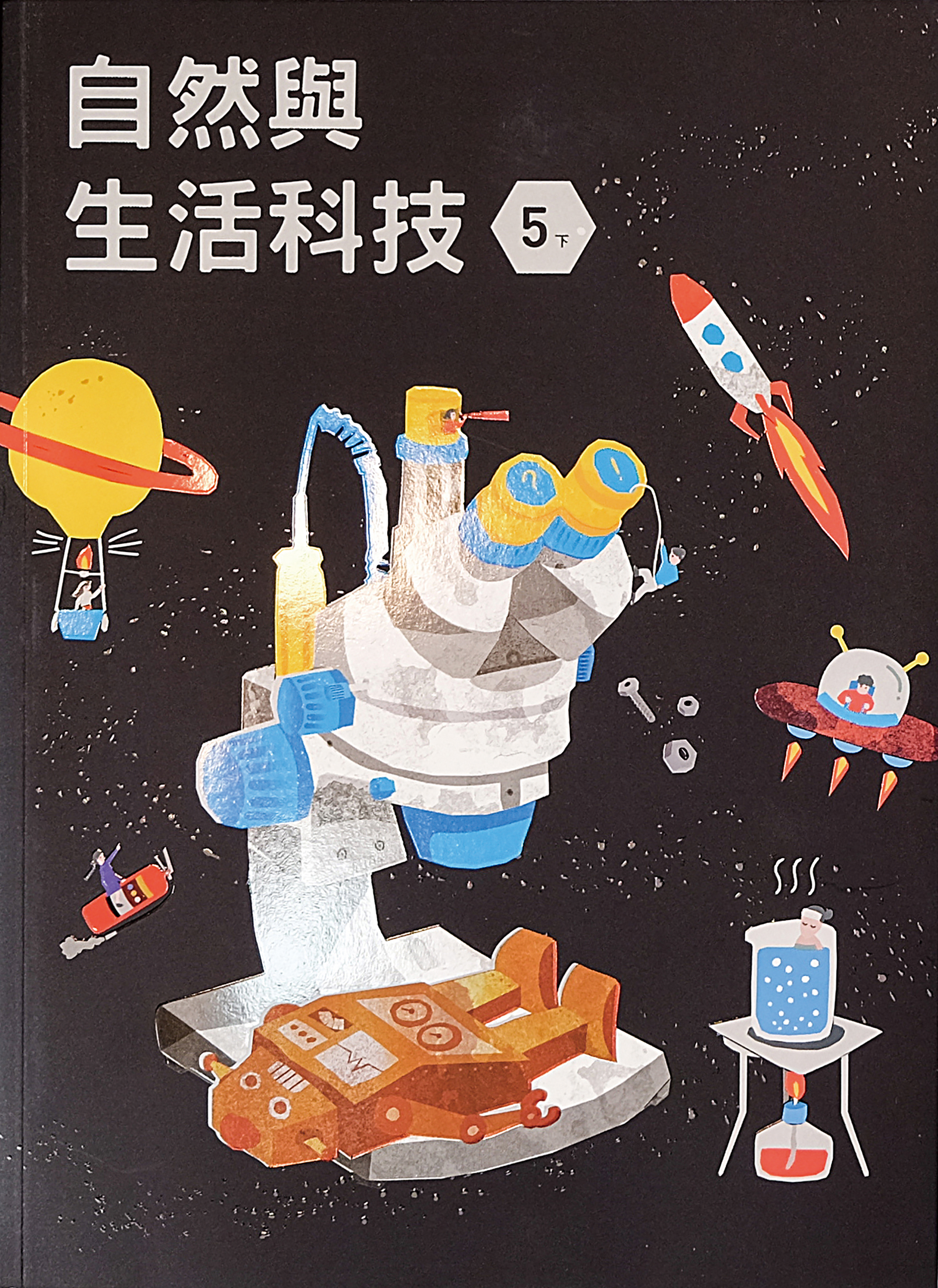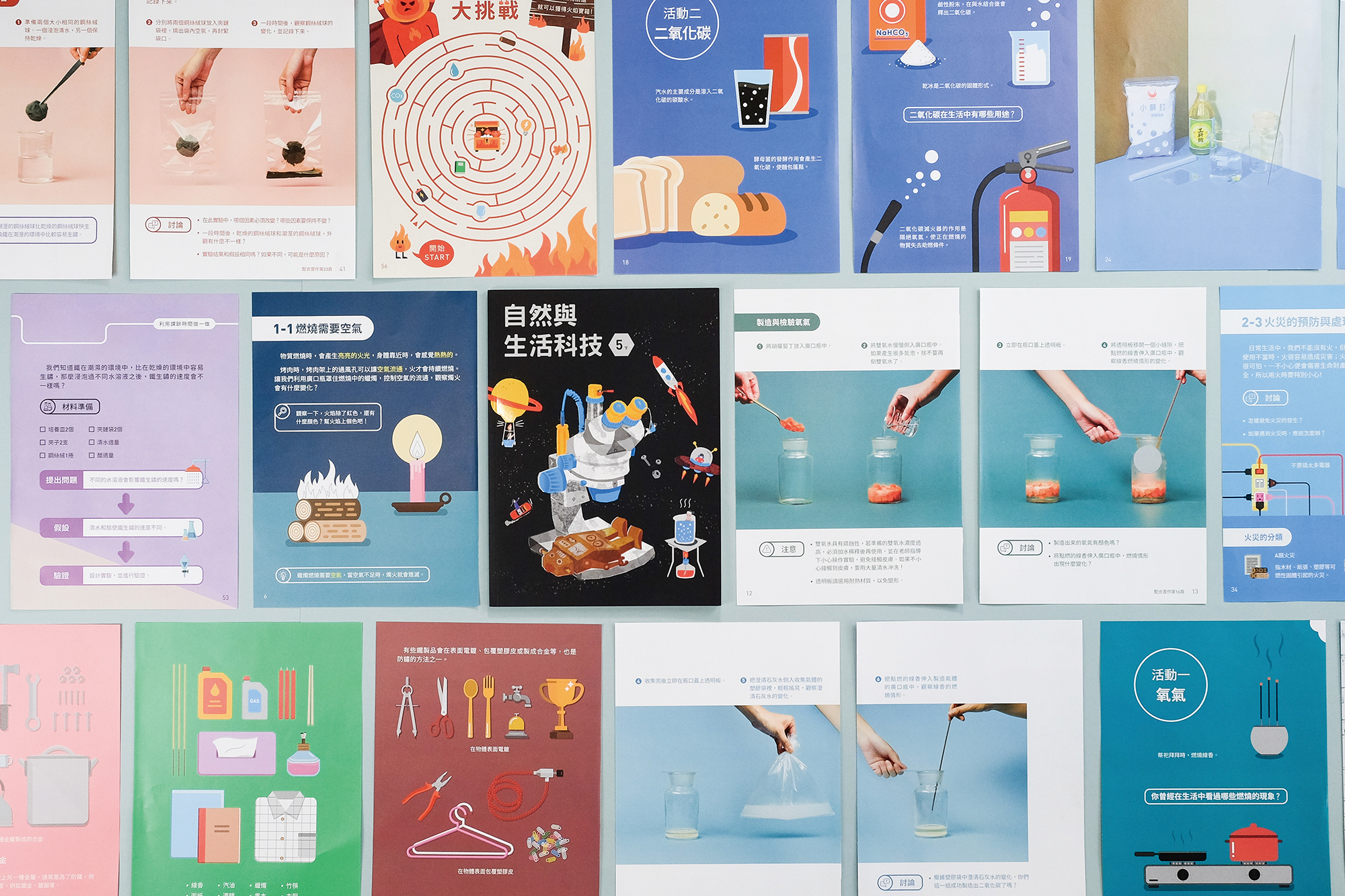 由設計師方序中所設計的數學課本,左右對開的開本方式,可以任意摺疊,讓課本宛如變形金剛。自然課本在設計師王艾莉的嘗試下,將實驗器材與步驟以棚拍方式呈現,提升圖片質感。內頁的底色也根據不同實驗的特性,氣體實驗用冷色調的藍色,燃燒實驗則是暖色調呈現。