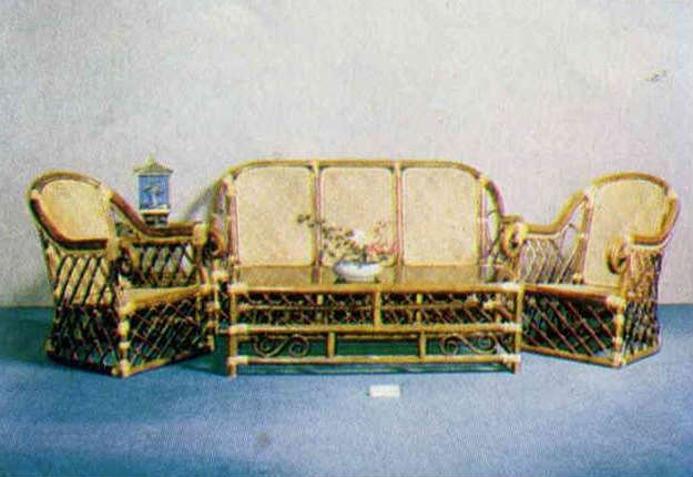 這一套客廳用的藤椅和茶几,顏色古樸,線條大方,如配上秀雅的椅墊,又是另一番風味。旁邊擺設的藤製酒櫃、矮櫃、鏡框、提包,都可顯見業者的巧思。