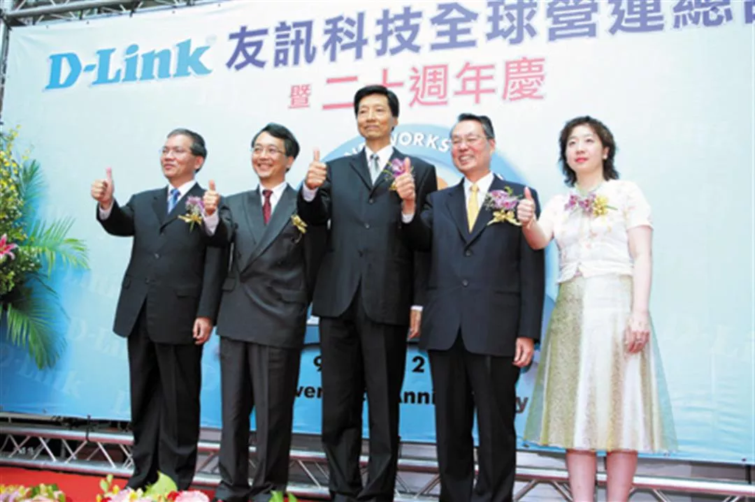 20週年慶當天,友訊在台北內湖的D-Link全球營運總部正式啟用,全球友訊員工齊聚致賀(右圖),而外貿協會董事長許志仁(左一)、宏硍偎帠郈鴗H施振榮(右二)及打造無線網路新都的台北市研考會主委周韻采(右一)都到場觀禮。左二為友訊科技總經理廖志誠,中為董事長高次軒。