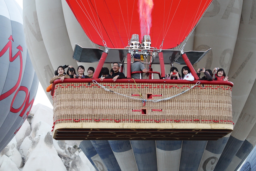 圓神集團每年都砸下巨資舉辦員工旅遊,足跡遍布世界各國。圖為土耳其之旅,簡志忠和同仁們搭上熱氣球合影。