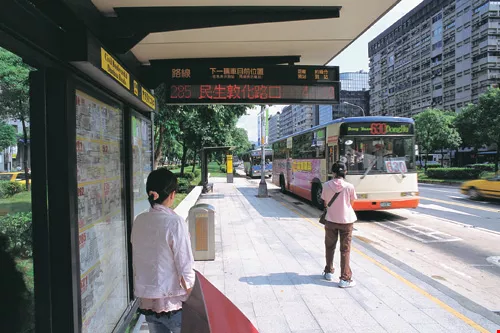 台北市捷運站接駁公車和少部分路線公車已經內建了定位系統,從站牌外的液晶看板可以知道公車何時到站,不必再痴痴遙望。