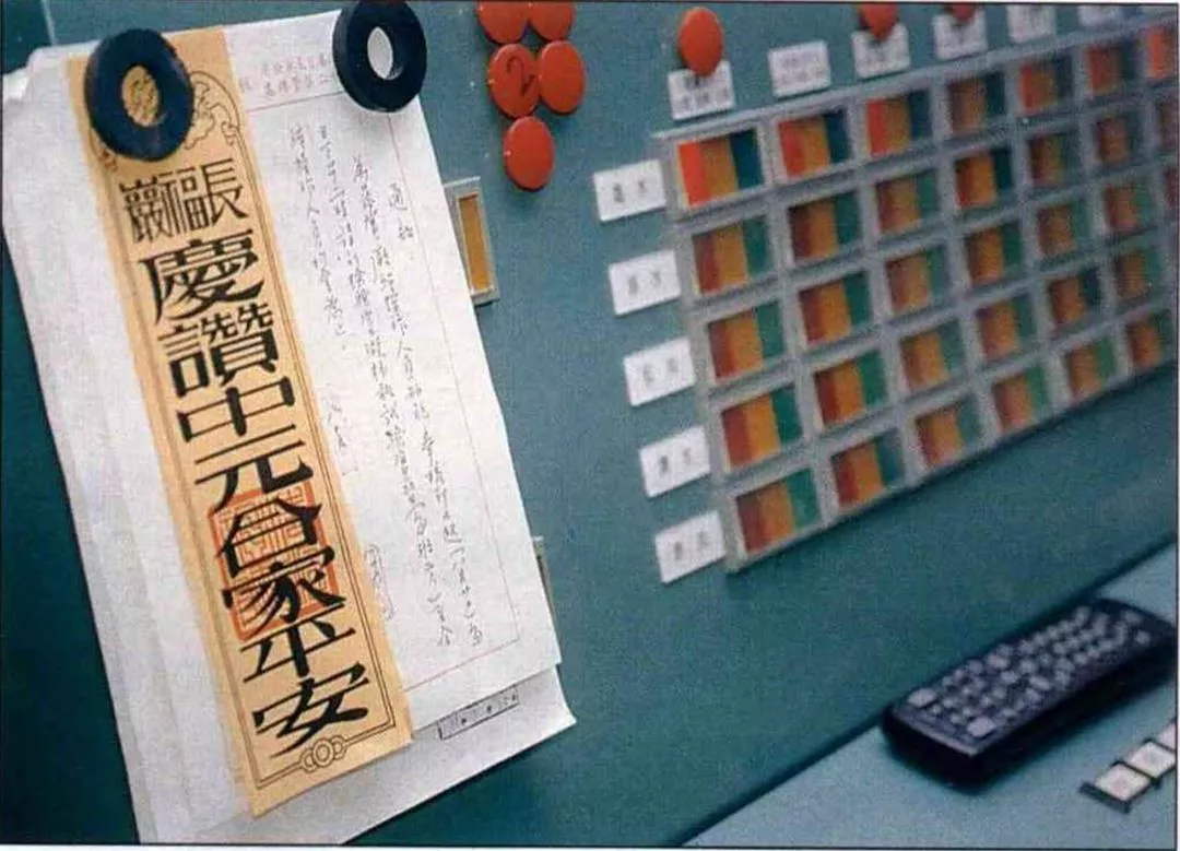 水庫放出混濁的泥巴水,下游淨水廠只好多加消毒藥、沉澱劑淨化水質。石門水庫下游的板新水廠裏貼了平安符,是自求多福?或保佑下游喝水人?(張良綱)