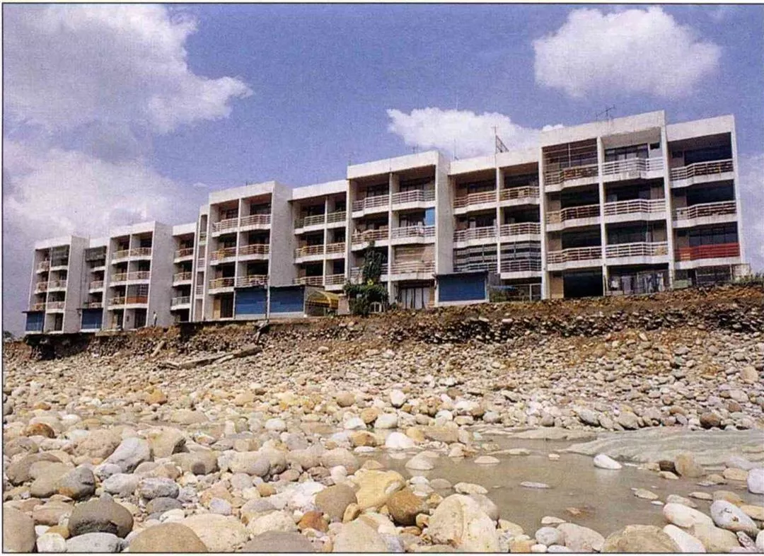 石門水庫扮演了將近三十年的風景特定區,許多公寓就蓋在水庫邊,但隨著河床流失,房子快成了「落水屋」。(張良綱)