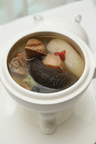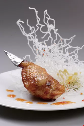 第二道閩菜之首──佛跳牆,則盛在子母口、兩側為長方形立耳,器底為3隻蹄形足的戰國「弦紋鼎」,故宮晶華以細緻光滑的陶瓷替代原來質樸厚實的青銅,這只仿古容器雖然好看大氣,但不太容易捧持,試菜時就打破了二十多個,對端菜的侍者是一大難題,得多加練習後,才能穩穩端上桌。