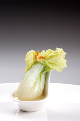 國寶宴的第一道菜就是令人驚豔、亭亭玉立的翠玉白菜,精選來自彰化的娃娃菜,白菜上放了兩尾東港櫻花蝦偽裝螽斯,栩栩如生的造型讓人捨不得下箸。料理難處在,火候不能過熟,否則白菜軟爛站不住,而支撐白菜的那根湯匙狀容器也功不可沒,造型取自漢代的盥洗器皿「匜」(聲同宜)。
