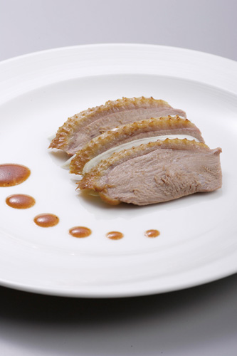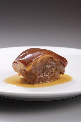 來自香港的主廚蕭廣安表示,這是他最滿意的作品,為了達到維妙維肖,他看著印製出來的肉形石照片反覆試作了十多次才成功。吃起來果然肥瘦相間,汁多入味。