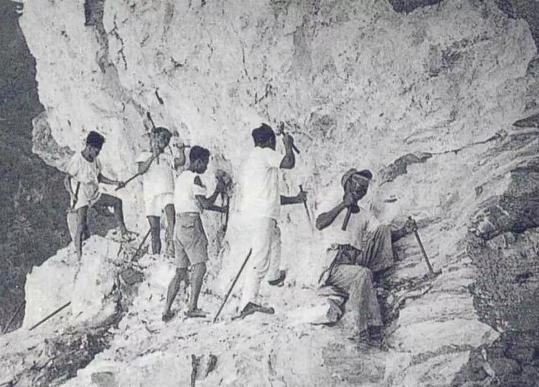由於地質脆弱無法使用大型機械開拓挖掘,中橫大部分工程全是由人力一鍬一鏟,一斧一鑿完成。 (太魯閣國家公園管理處提供)(太魯閣國家公園管理處提供)