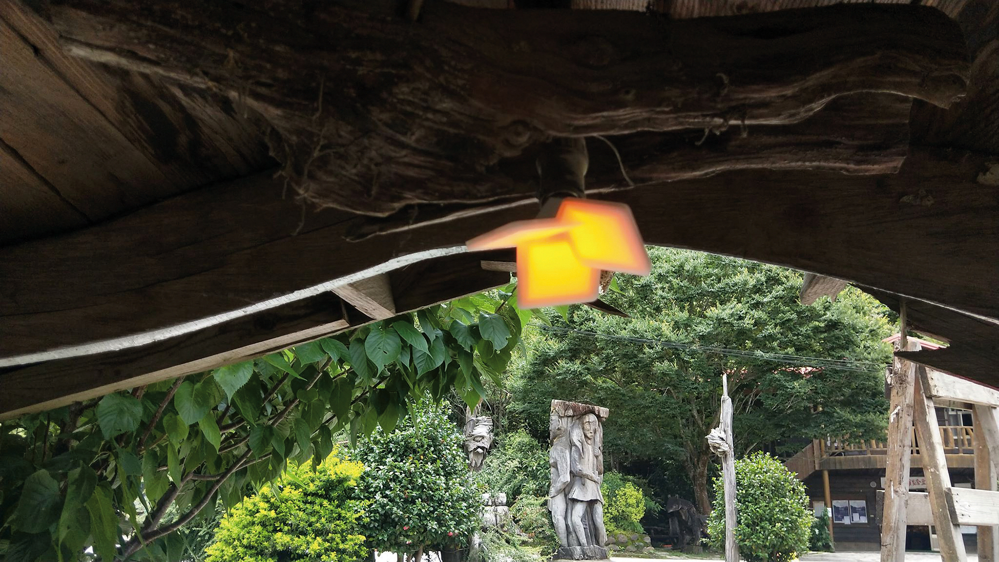 燭光OLED三瓣燈安裝在司馬庫斯的小木屋,柔和的燈色與自然美景相映。(清大OLED照明團隊提供)