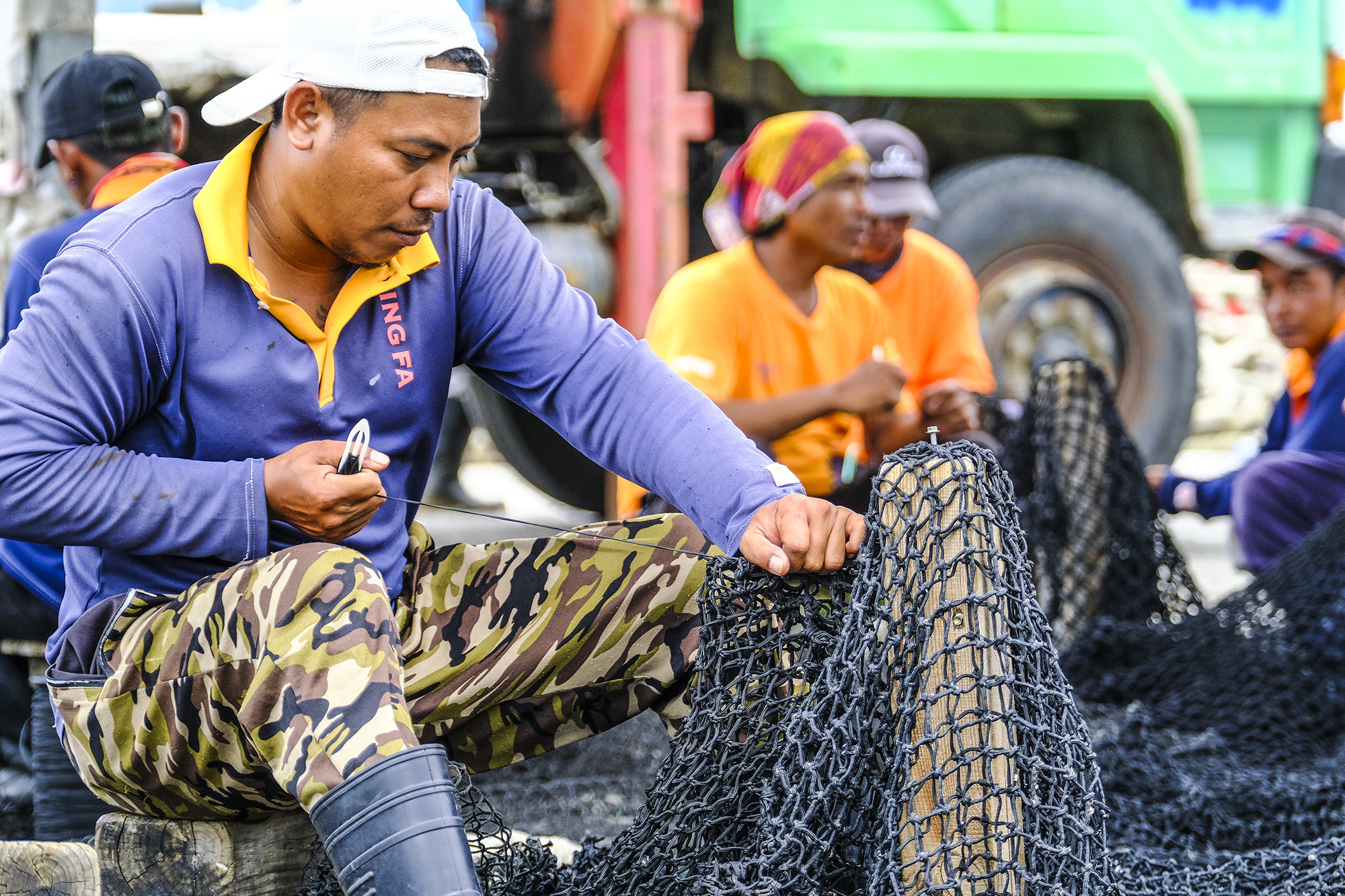 因此花了兩、三天收回岸上的大片漁網,需先經過高壓水柱清洗附著在上面的生物,接著再針對破裂的網目進行修補,平常在海上與浪拚搏的漁人們,面對珍貴的網具也不得不放輕動作,操作手上的針梭為網具加固。