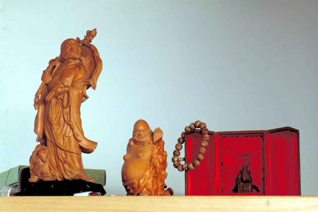 案頭佛像是朱邦復心靈的寄託。(鄭元慶攝)