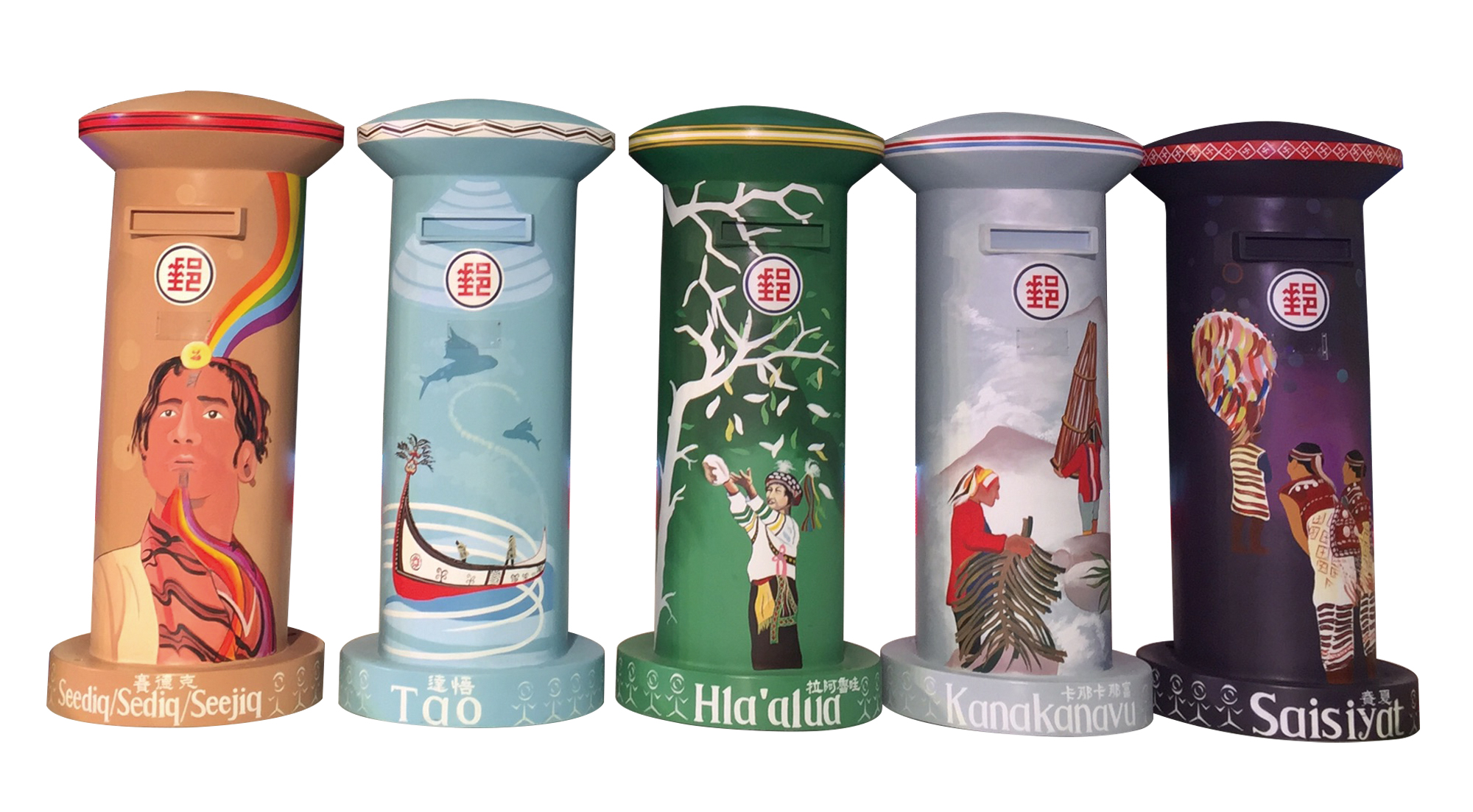 中華郵政找來原住民藝術家拉夫拉斯‧馬帝靈,依據各族的特色繪製郵筒,魯凱族的百合、達悟族的拼板舟與飛魚、鄒族的瑪雅斯比祭典等都躍上郵筒,色彩鮮豔繽紛。