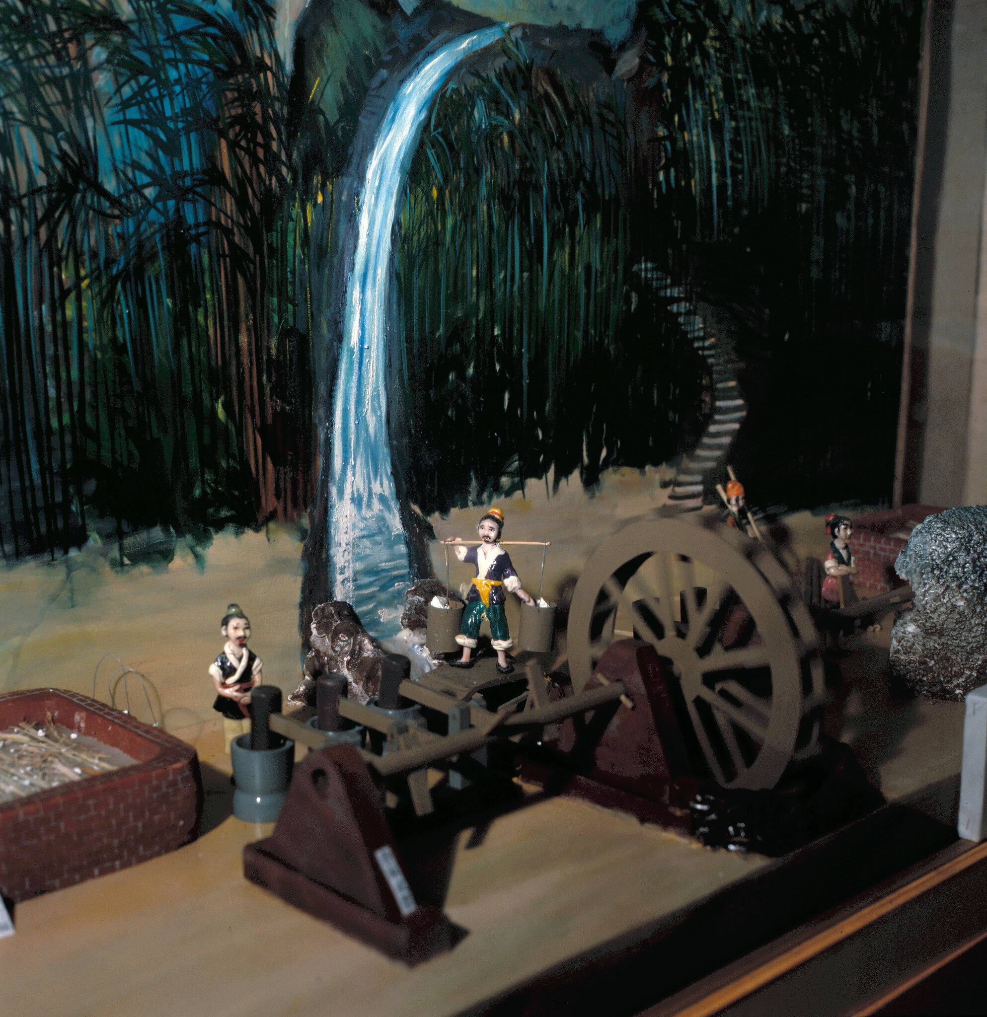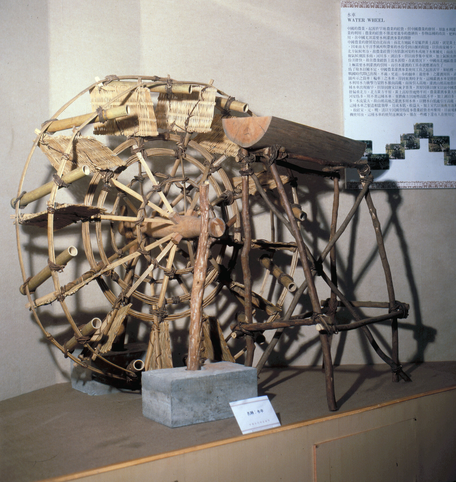 水車,是中國水利灌溉中,一種極重要的設備。它利用流水的衝力,將低處的水盛入一個個竹筒中,竹筒旋轉到高處,順勢把水傾入容器中,因而把低處的水引接到高處。