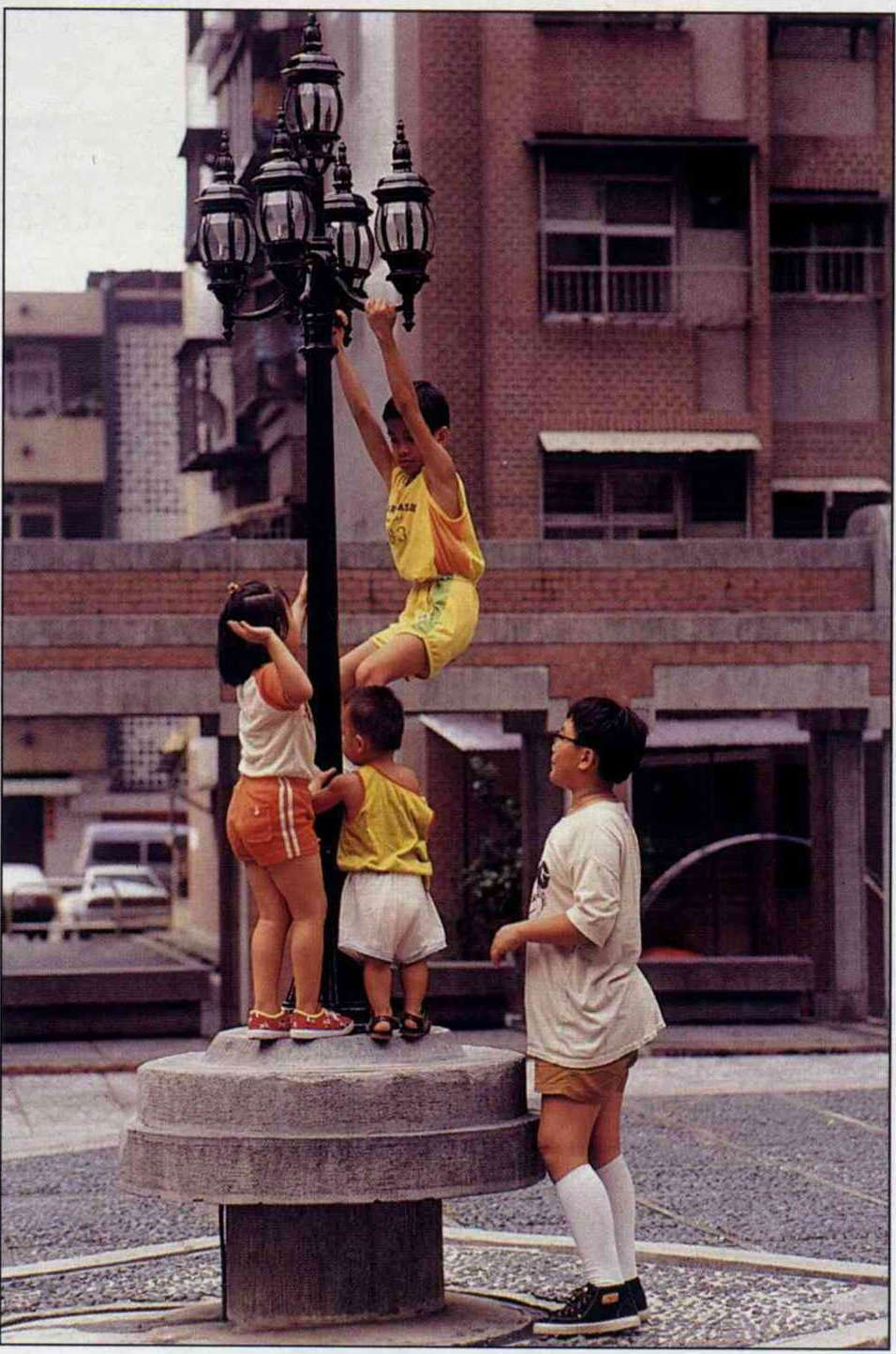 生長在都市叢林裡的孩子,沒有機會爬樹,只好爬爬路燈了。(卜華志攝)(卜華志攝)