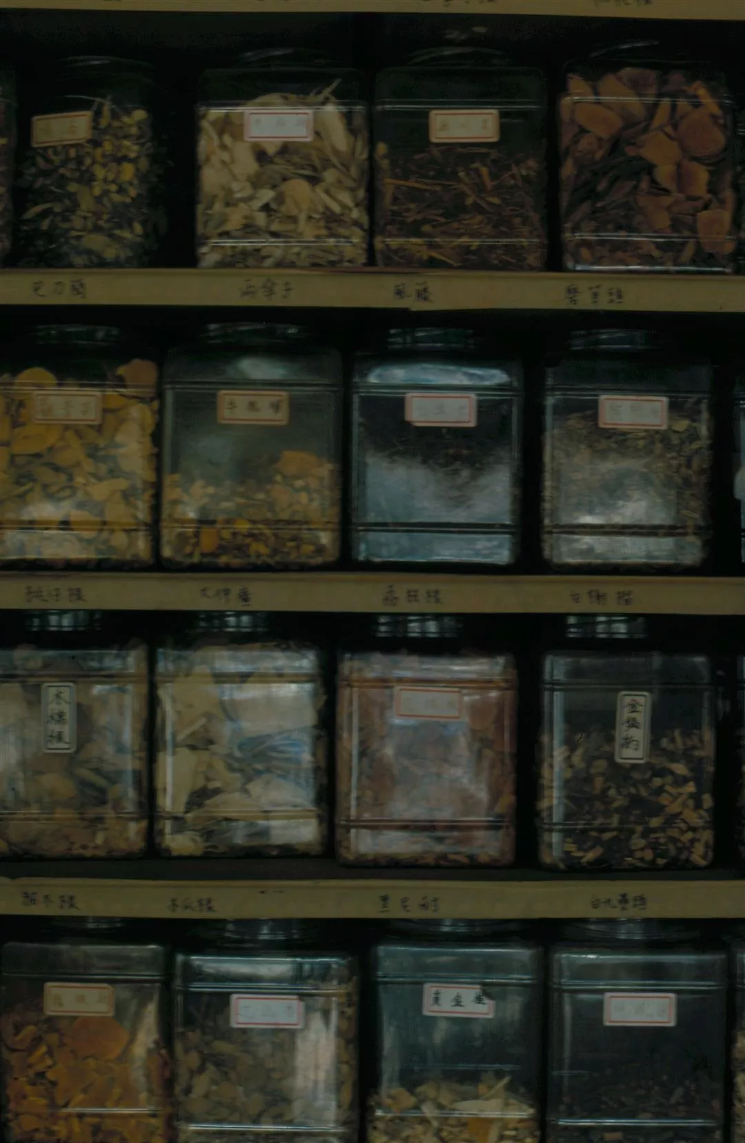擺在罐子裏的有許多是木本植物,都事先經過加工、切片,僅保留根、莖等藥用部位。(鐘永和)