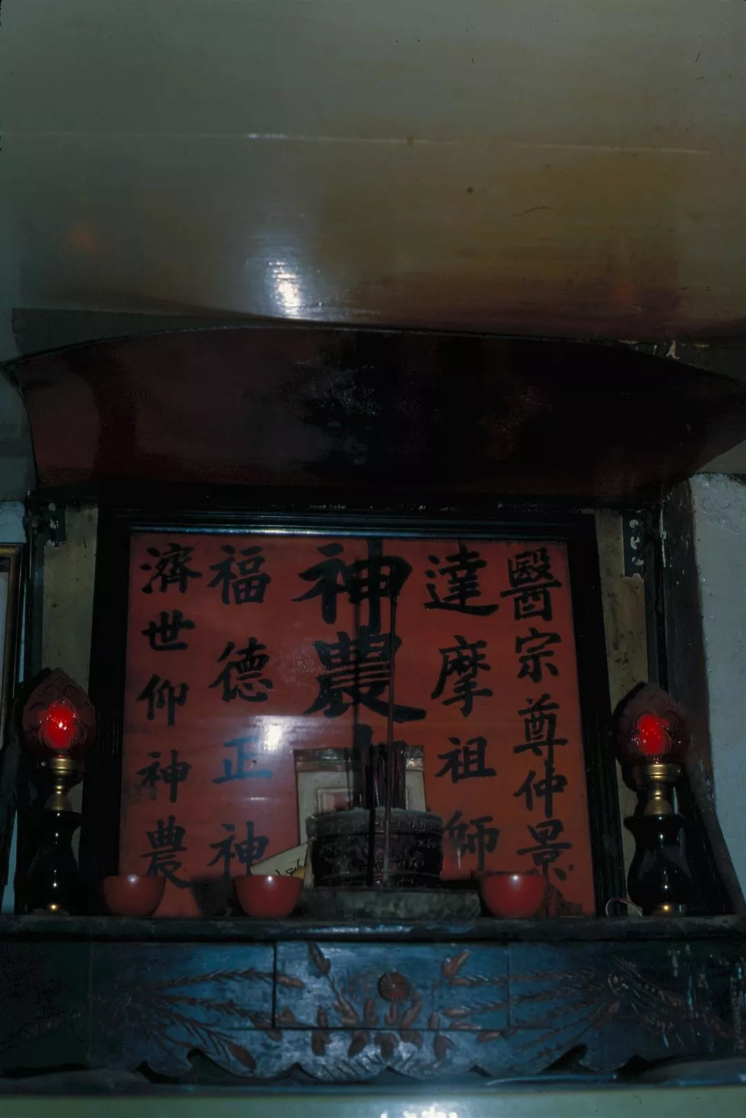 許多青草店供有藥草祖師「神農氏」的牌位。(鐘永和)