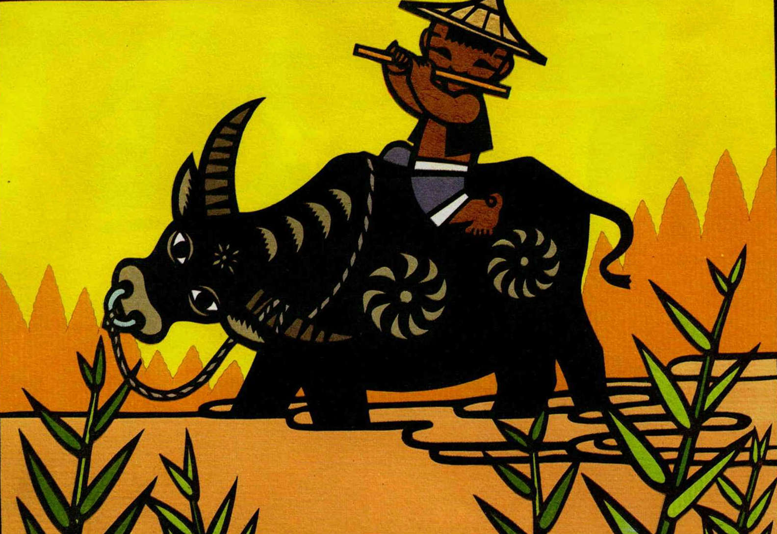 小水牛 文‧圖.洪義男 圖‧洪義男 1987 9月 EN 分享: (四川省) 東家有條小水牛, 彎彎角, 墨蹄腳; 春來吃青草, 冬來吃糠頭(榖皮); 一天犁田五六畝, 不要主人打和吼; 繩子盤上牛角角, 見了主人耳撲撲, 拉車推磨都能做, 常背小弟過水溝。 分享: