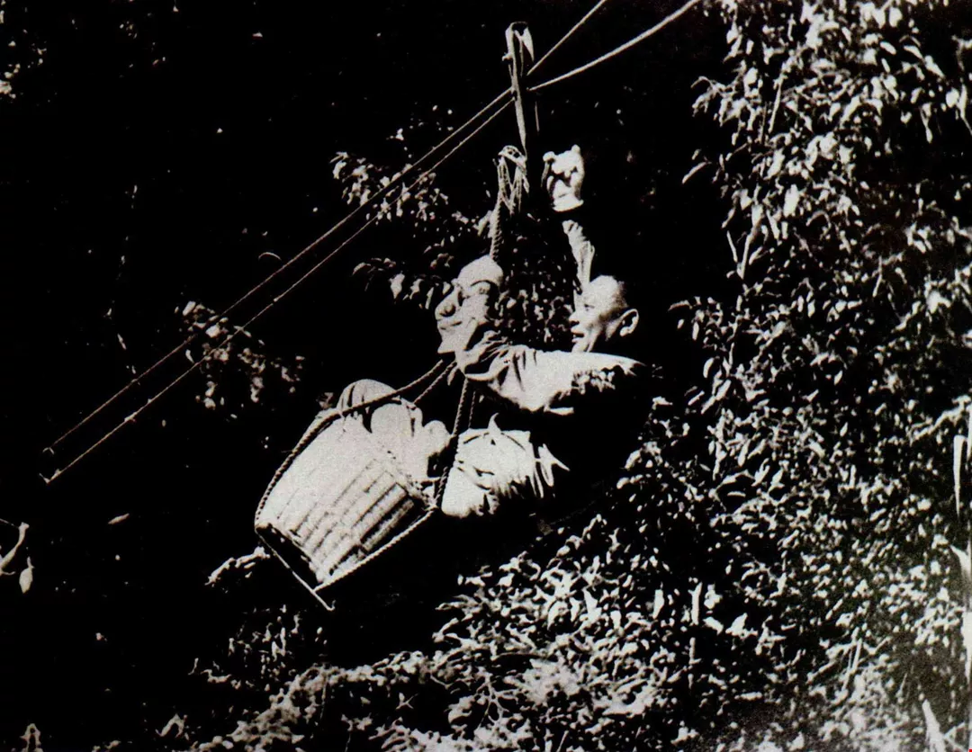橫貫公路施工期間,經國先生經常奔走於中央山脈的險阻山路中,甚至乘坐流籠越過山頭。(榮工處提供)
