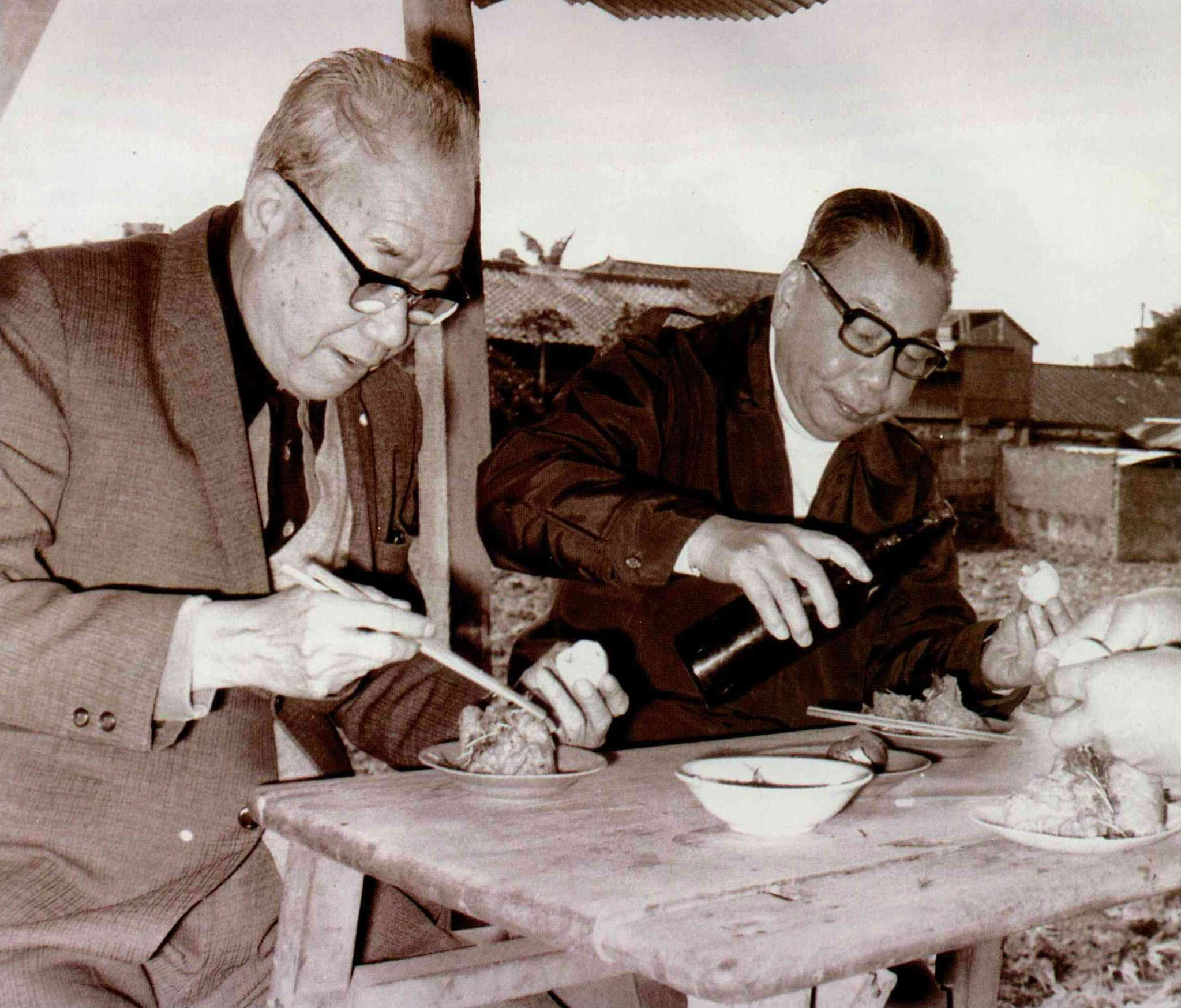 民國六十四年一月,當時擔任行政院長的經國先生與台灣省政府主席謝東閔先生,巡視苗栗頭份。兩人就在小攤上午餐、休息。(中央社提供)