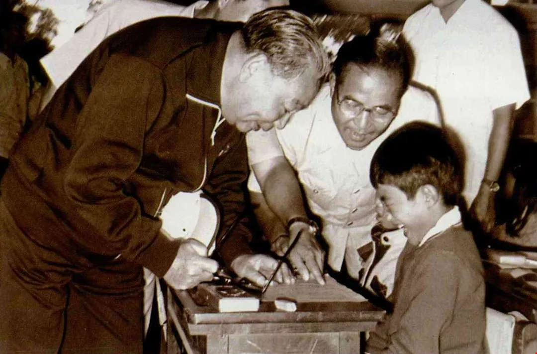 經國先生最喜歡天真自然的孩童,孩子們也喜歡他。他每到一處,總要看看孩子,也總傳出一波波笑聲。(中央社提供)