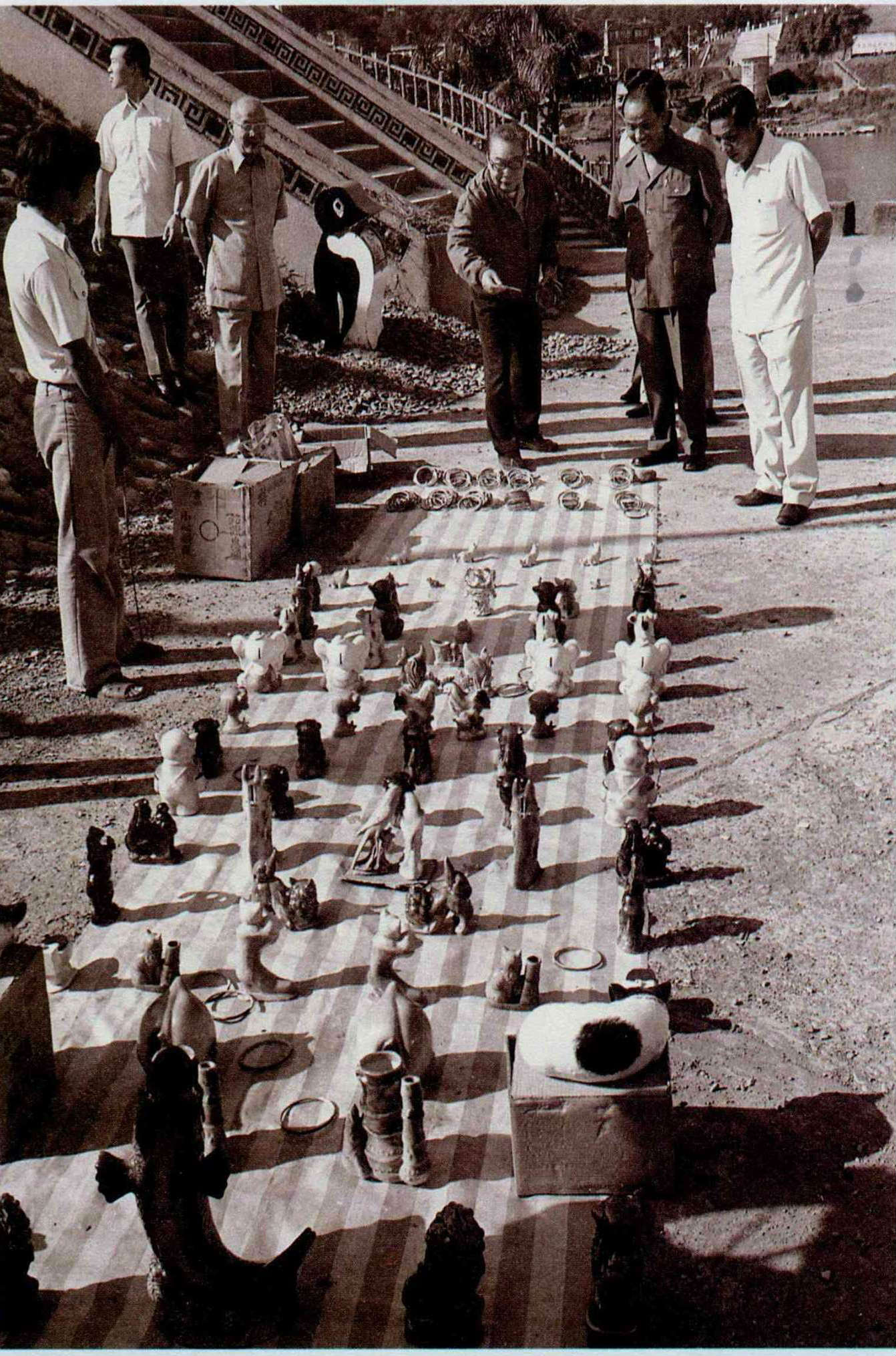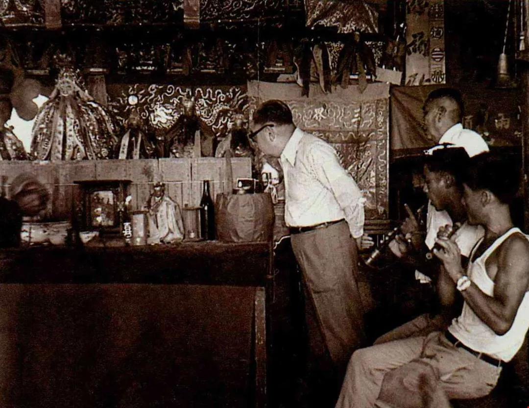經國先生也有天真好奇的一面,輕裝便服的他來到鄉間,短暫的休息時間就專心研究起桌上的神像。(中央社提供)