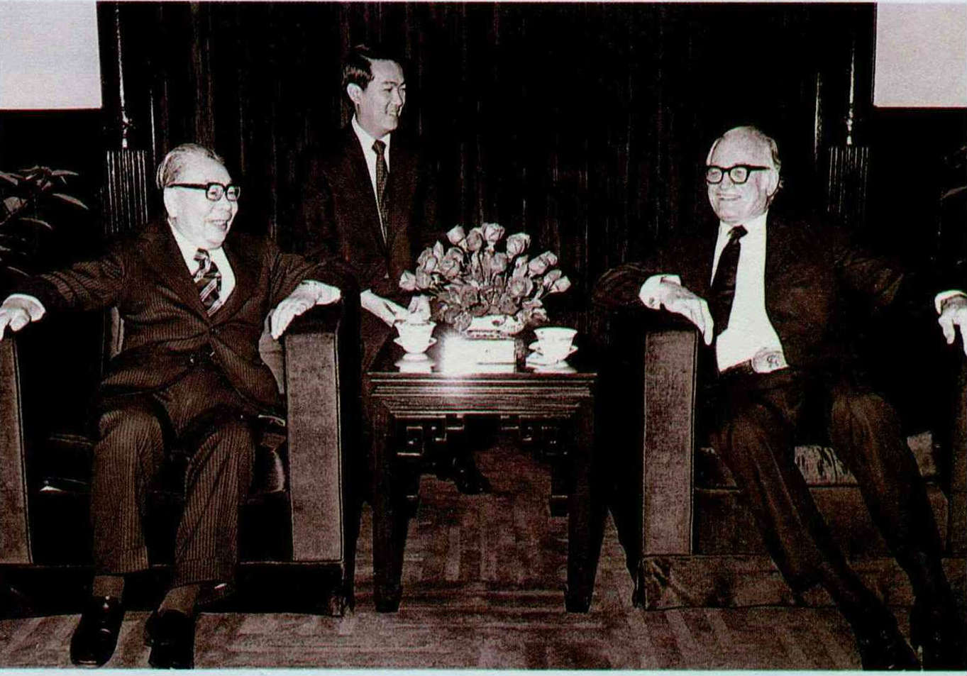 民國六十八年,美國聯邦參議員高華德來訪,與經國先生相談甚歡,中為負責翻譯的現任國民黨副秘書長宋楚瑜。(高稚偉攝)