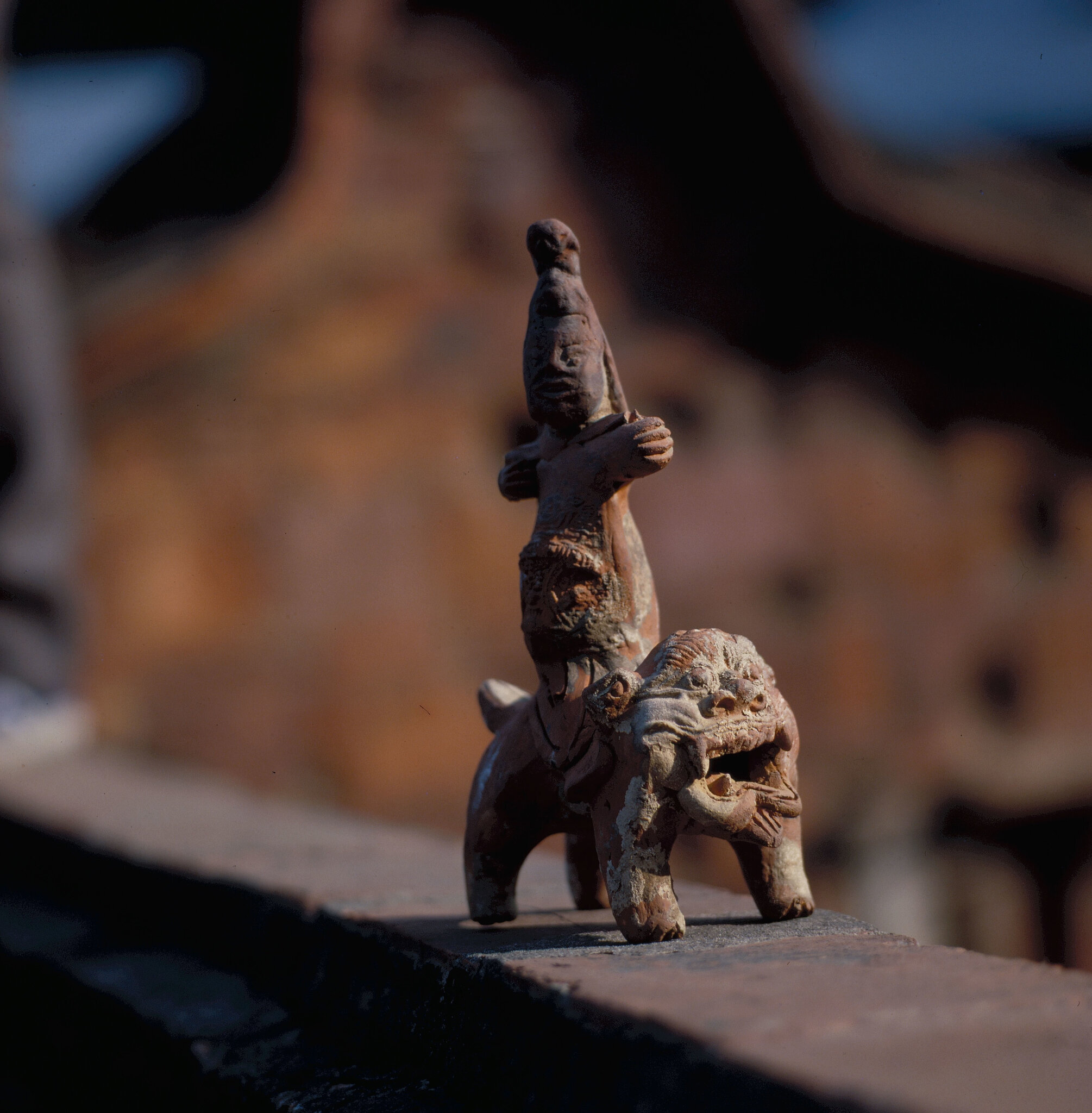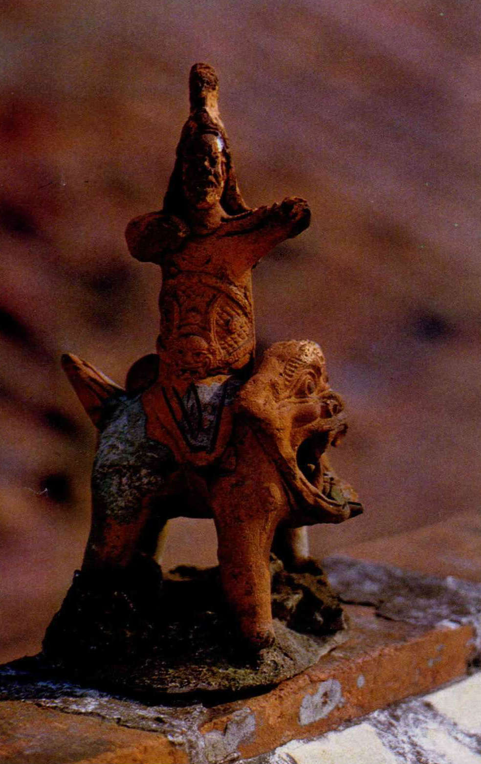 最近幾年來筆者分別從王吉成、劉三豪和陳明亮諸先生處,購得三尊甚為罕見的頭戴盔帽,身穿甲冑,騎獅彎弓,狀甚威猛的武士塑像。