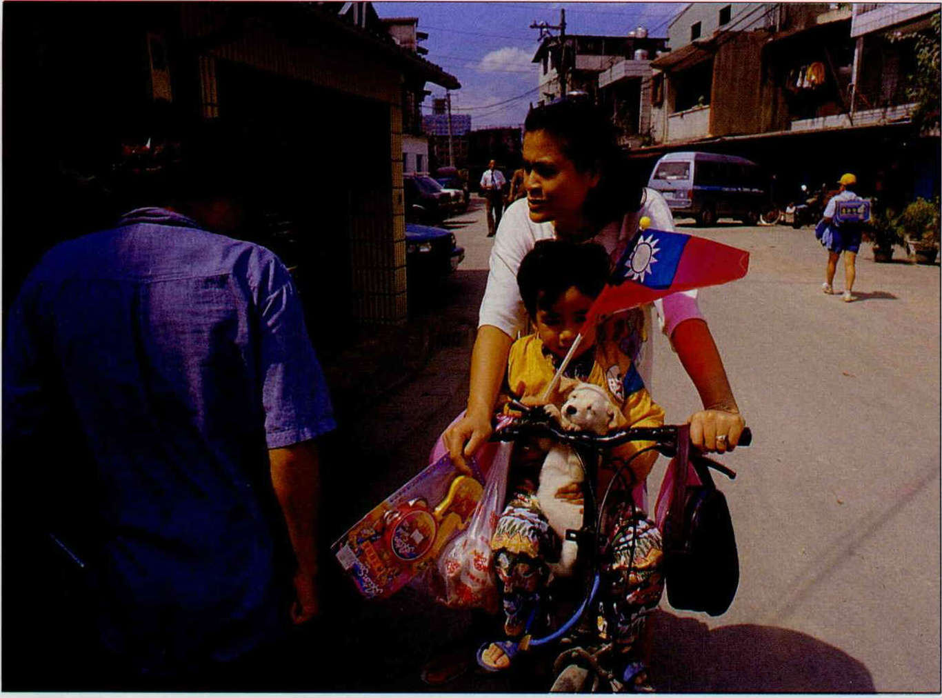 雙十佳節,陽光普照,抱著心愛的狗狗和新買的玩具,和媽咪騎著腳踏車在社區裏兜風,好不快活。(邱瑞金)