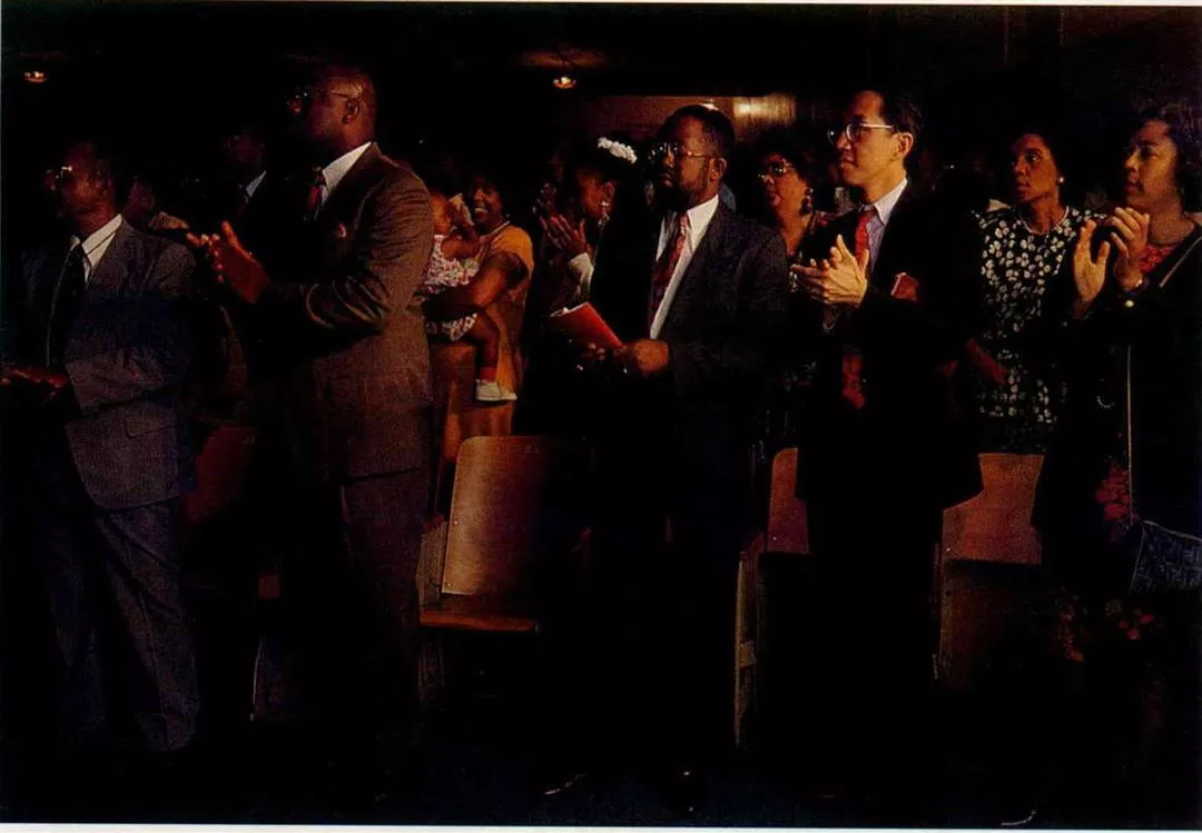 少數族群從政時,永遠面臨爭取多數人認同的困難。圖為華裔美人胡紹基(右三)競選洛杉磯市長時,赴黑人社區拉票情形。