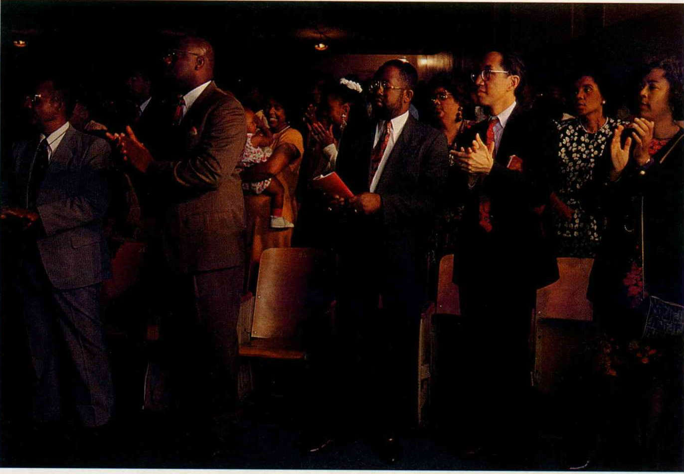 少數族群從政時,永遠面臨爭取多數人認同的困難。圖為華裔美人胡紹基(右三)競選洛杉磯市長時,赴黑人社區拉票情形。