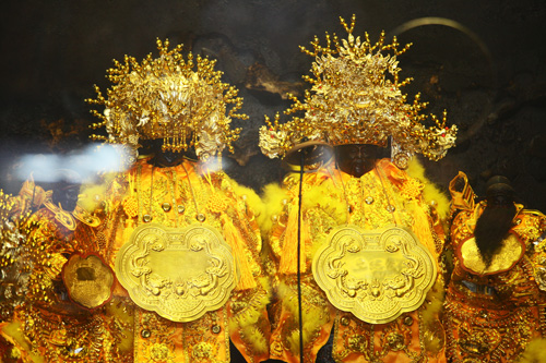 紫南宮內「金光閃閃」的土地公、土地婆,祂們身上掛的金飾及大金牌,全為信眾答謝而來。