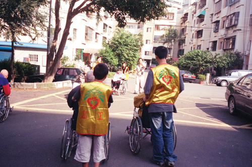 「合作式中途班」有一堂「社區服務」課,不少學生從服務過程中看見別人的需要,也重新發現了自己。右圖為向陽學員進行社區服務一景。(向陽學園提供)