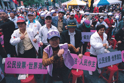 二○○三年十一月二十七日,立法院在朝野政黨的激烈角力中,三讀通過了以國民黨和親民黨版本為主的公民投票法。法案中除了排除預算、租稅、投資、薪俸及人事事項不得公投外,對於人民是否可以公投修憲、行政機關是否可以主動提出「諮詢性公投」等,均做了若干限制,並明訂人民提案公投時,提案人數需達到總統選舉人數的千分之五,連署人數則需達百分之五,同時設立「公投審議委員會」來審核公投事項。