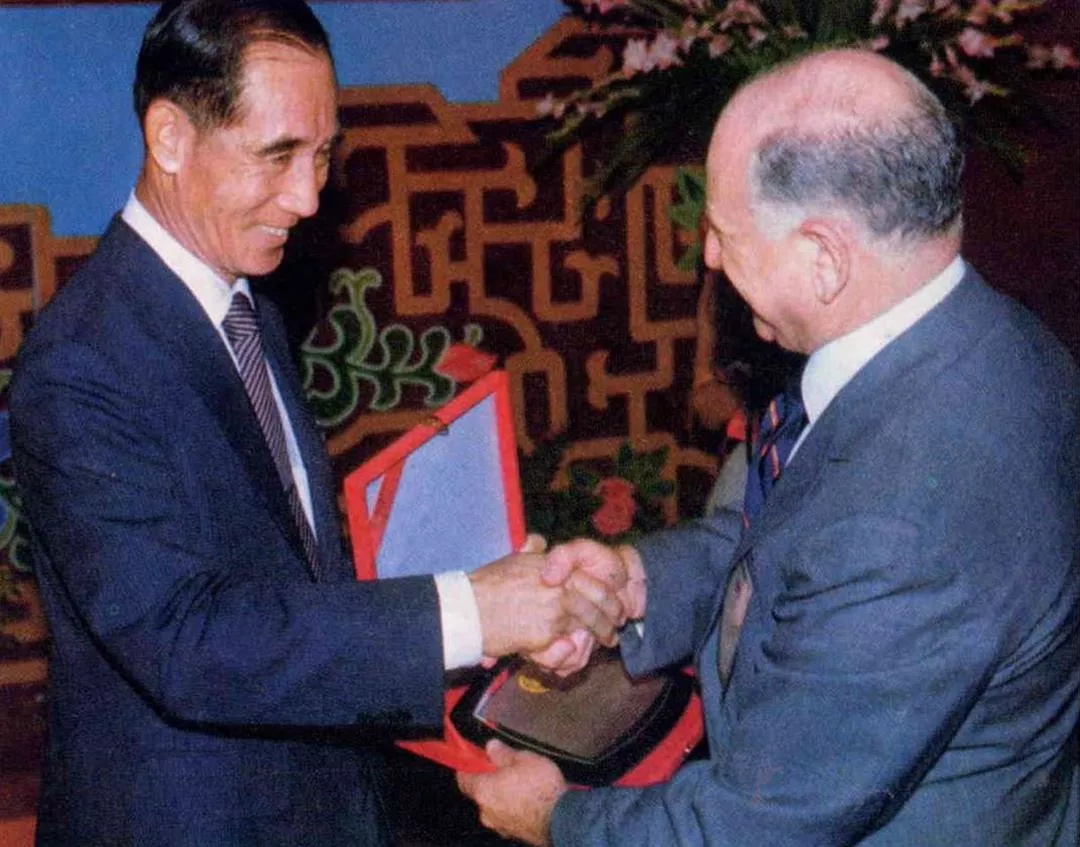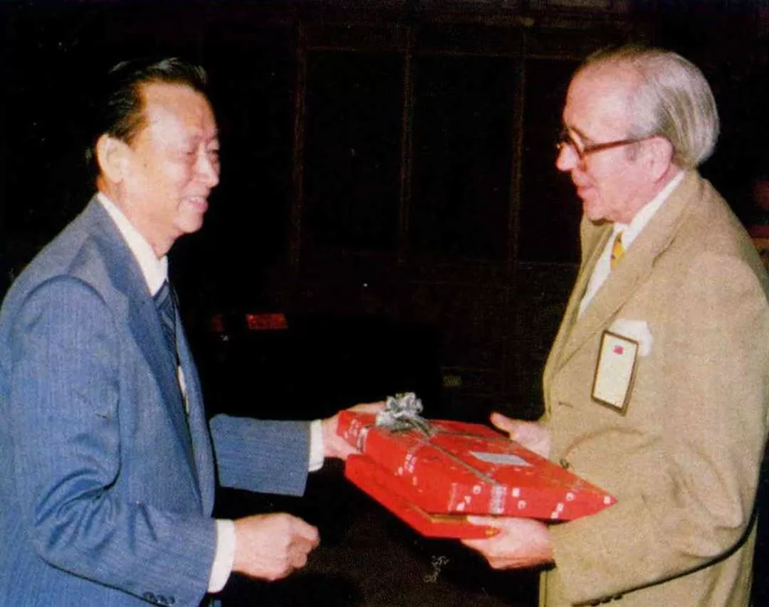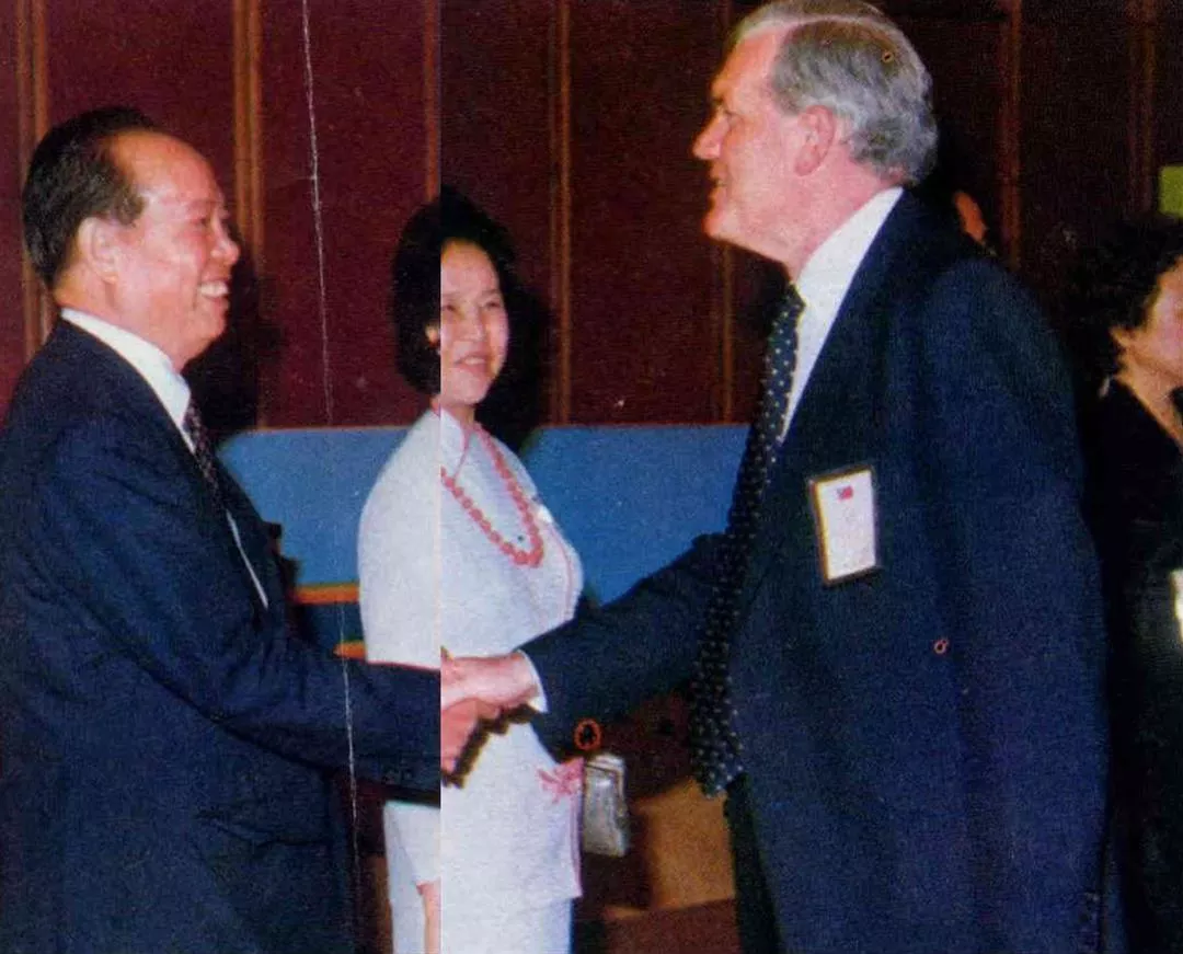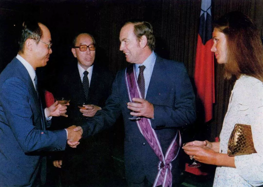 巴納德醫師偕夫人到外交部拜會外交部長朱撫松(左二)及外交部政務次長錢復(左一),並接受贈勳。(榮民總醫院提供)