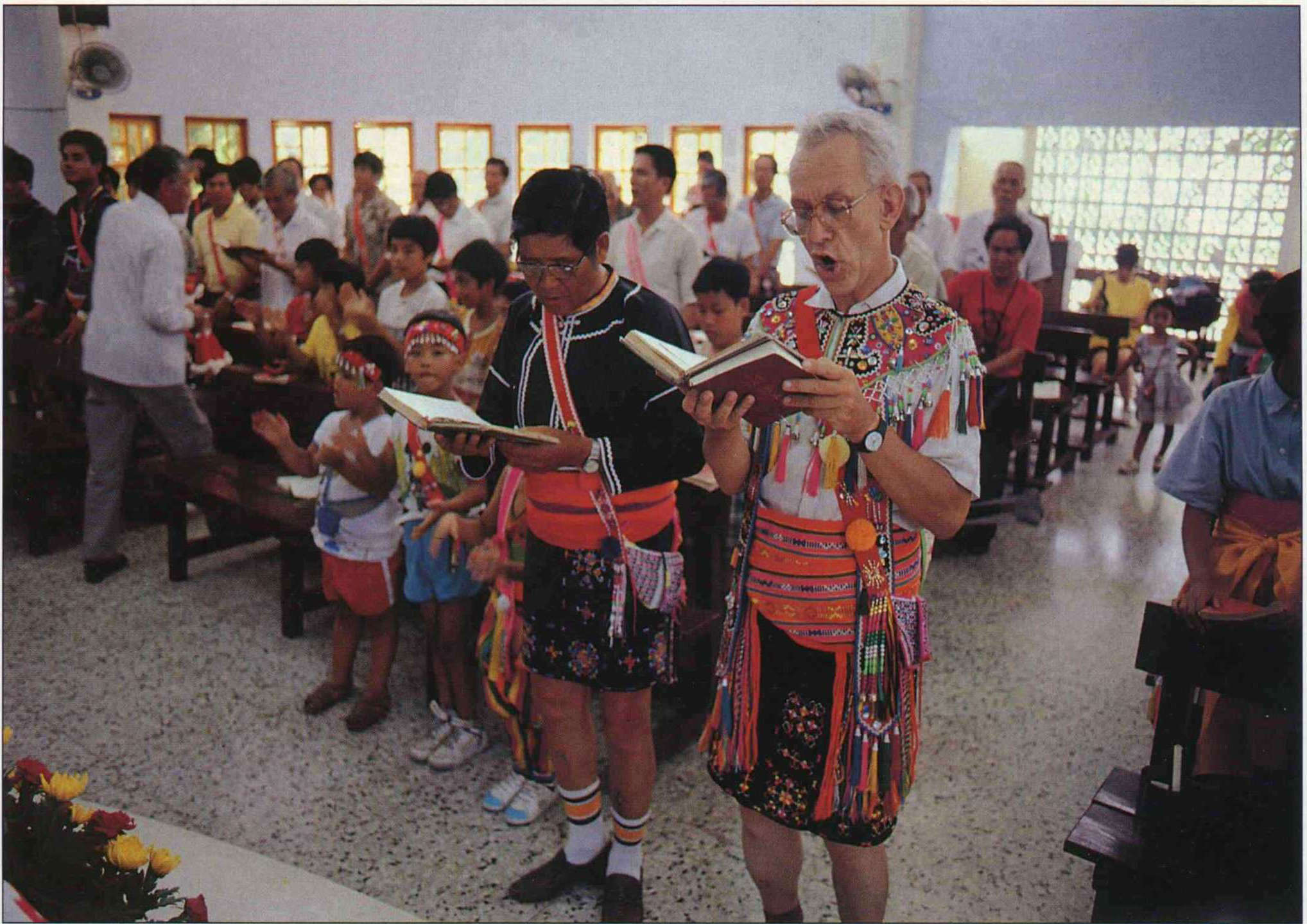 神職人員傳教往往入境隨俗,與民眾打成一片。望彌撒時,神父也可以脫下黑袍,穿上原住民服飾。(卜華志攝)