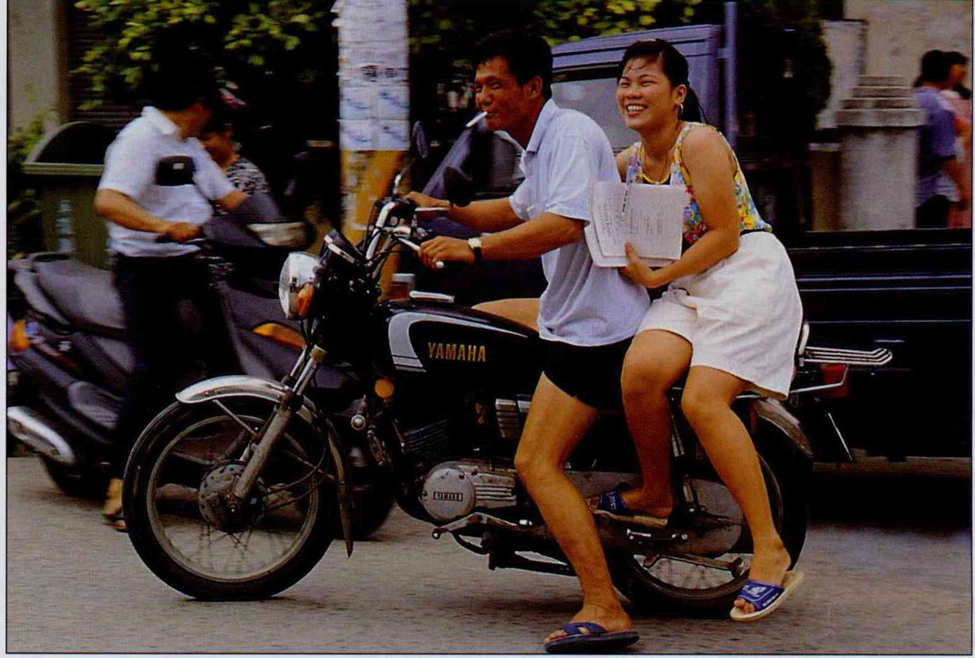 下課了,先生的「專車」來接太太回家做中飯。(張良綱)