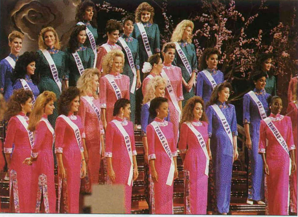 一九八八年在台北舉行的國際佳樂小姐選美會中,身材健美的各國佳麗,卻穿上線條柔和的旗袍。(鄭元慶攝)