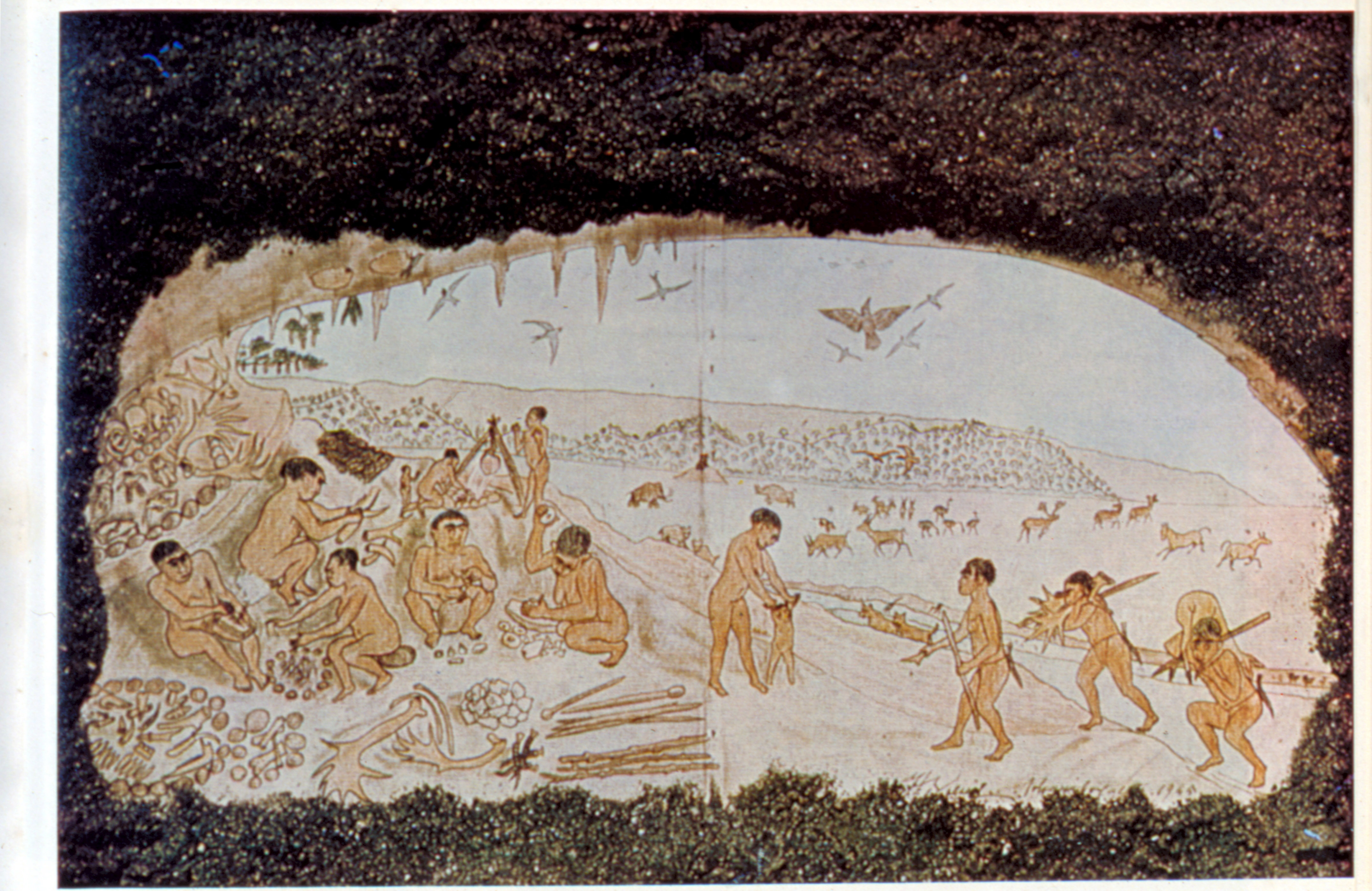 考古學家步日耶根據周口店發掘的資料,繪製成五十萬年前「北京原人生活示意圖」。圖左下有排列整齊的獸骨、獸牙,也許就是原始的「收藏」。(陳敏明)