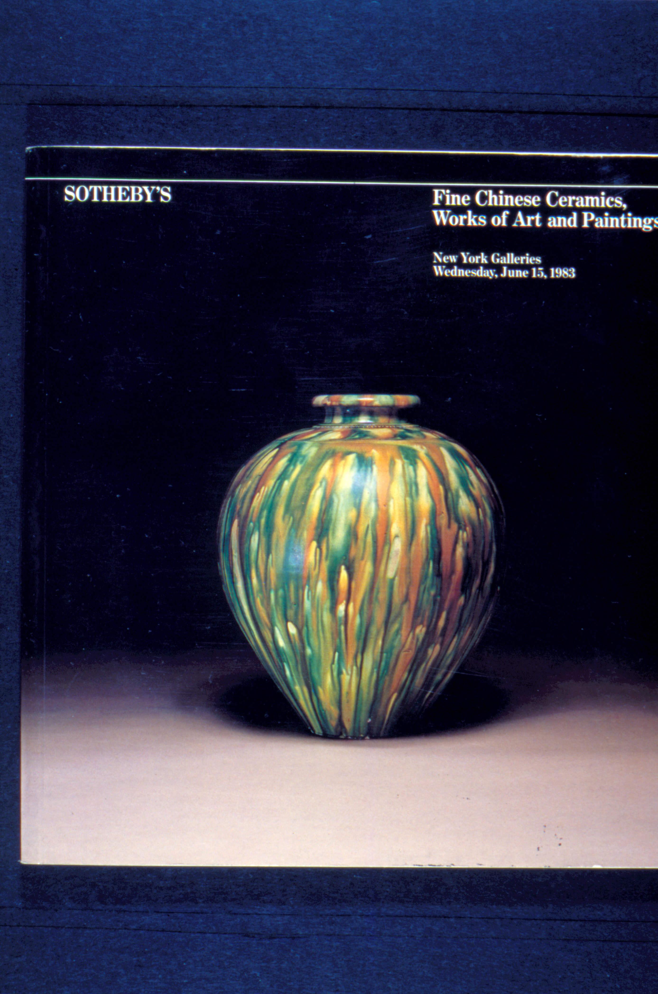 紐約蘇富比古董拍賣公司出版的一本中國古董的目錄,封面是一件即將拍賣完美的唐三彩花瓶,價格約在七至九萬美元。(陳敏明)