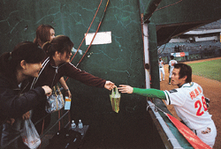 球迷隔著低矮的圍牆拿杯飲料給心目中的偶像。人情味濃的台灣,頻繁的球迷、球員互動是國內職棒一大特色。