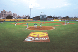 巨大的母企業logo標示著興農牛隊的主場。為了應付台中愈來愈紅火的職棒熱,台中市政府已決定興建一座新的棒球場,在那之前,這個高齡近七十的台中球場還是不得退役。