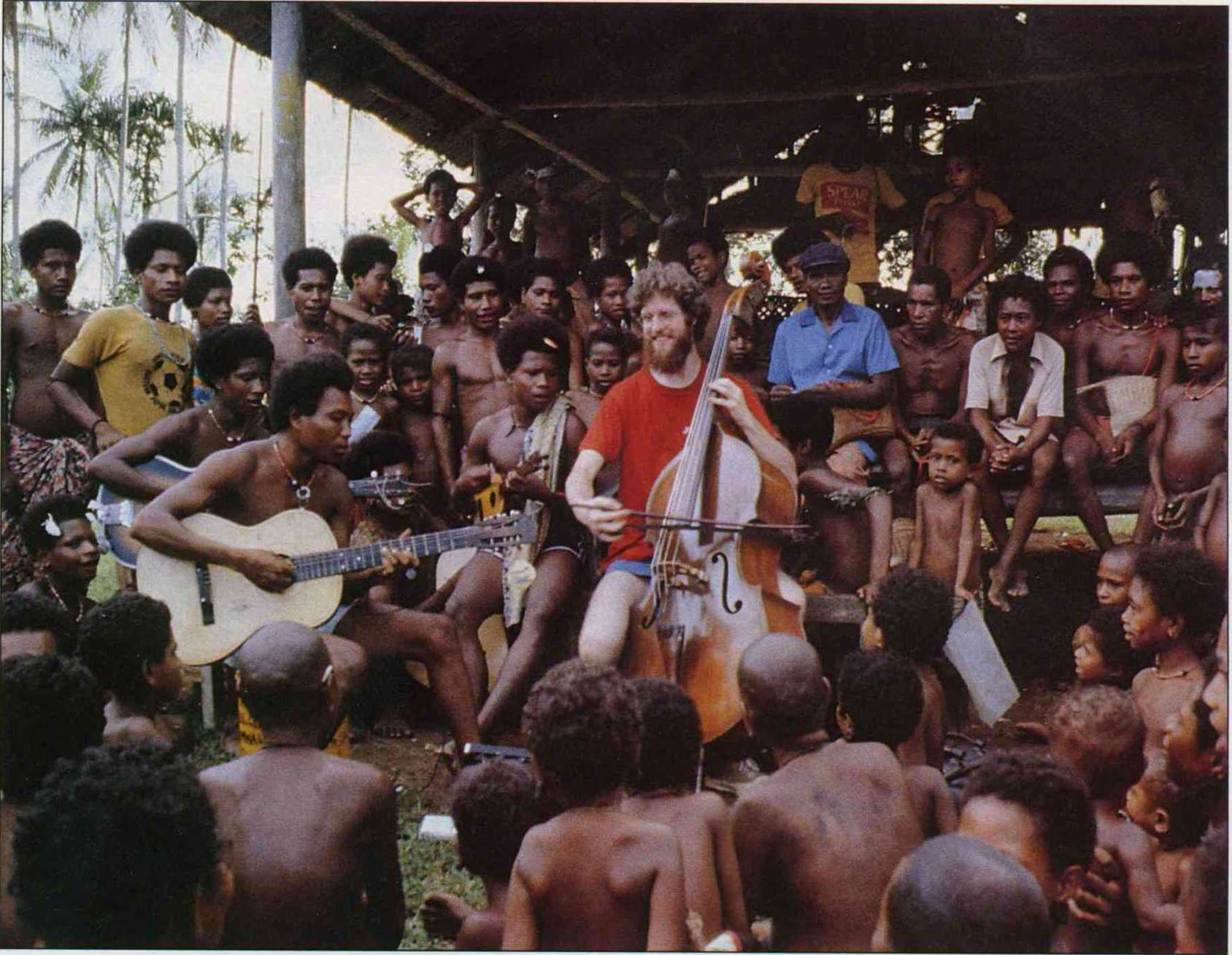 「當夜晚來臨,四周點起了火光,人群逐漸在我的大提琴周圍聚集,細雨輕撫著我們的肌膚,年輕人抱著吉他,我打開了錄音機的電源,……」——羅白華訴說他在新幾內亞的經歷。 (大大樹音樂圖像提供)(大大樹音樂圖像提供)