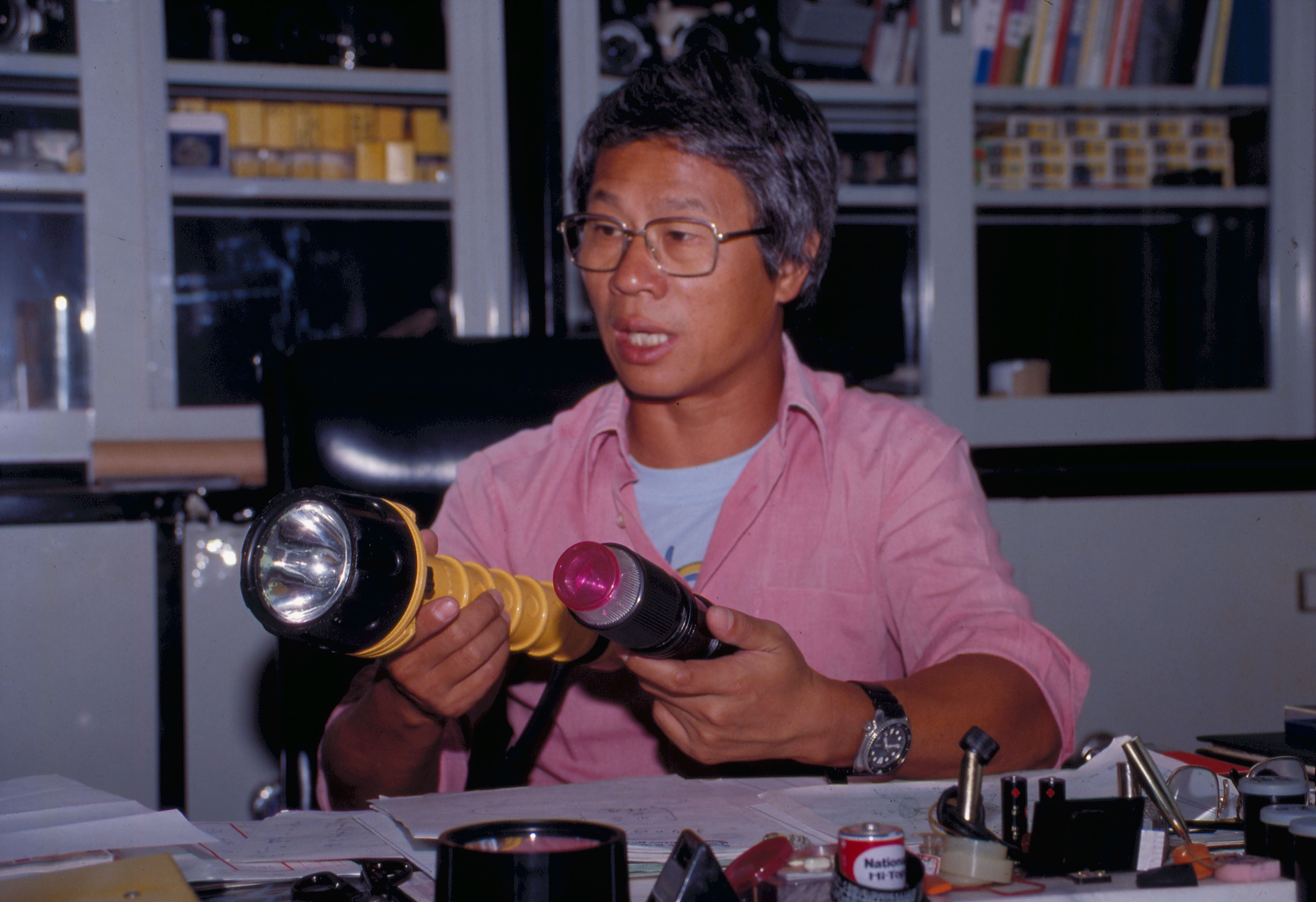 他又把大型笨重的潛水手電筒改良得較輕巧,更可依使用者的需要分節裝卸;平面的玻璃燈罩也改為立體,使照射的範圍更廣;並在筒底加上紅色蓋子,拿來套在燈罩上,可發出紅色燈光的求救信號。