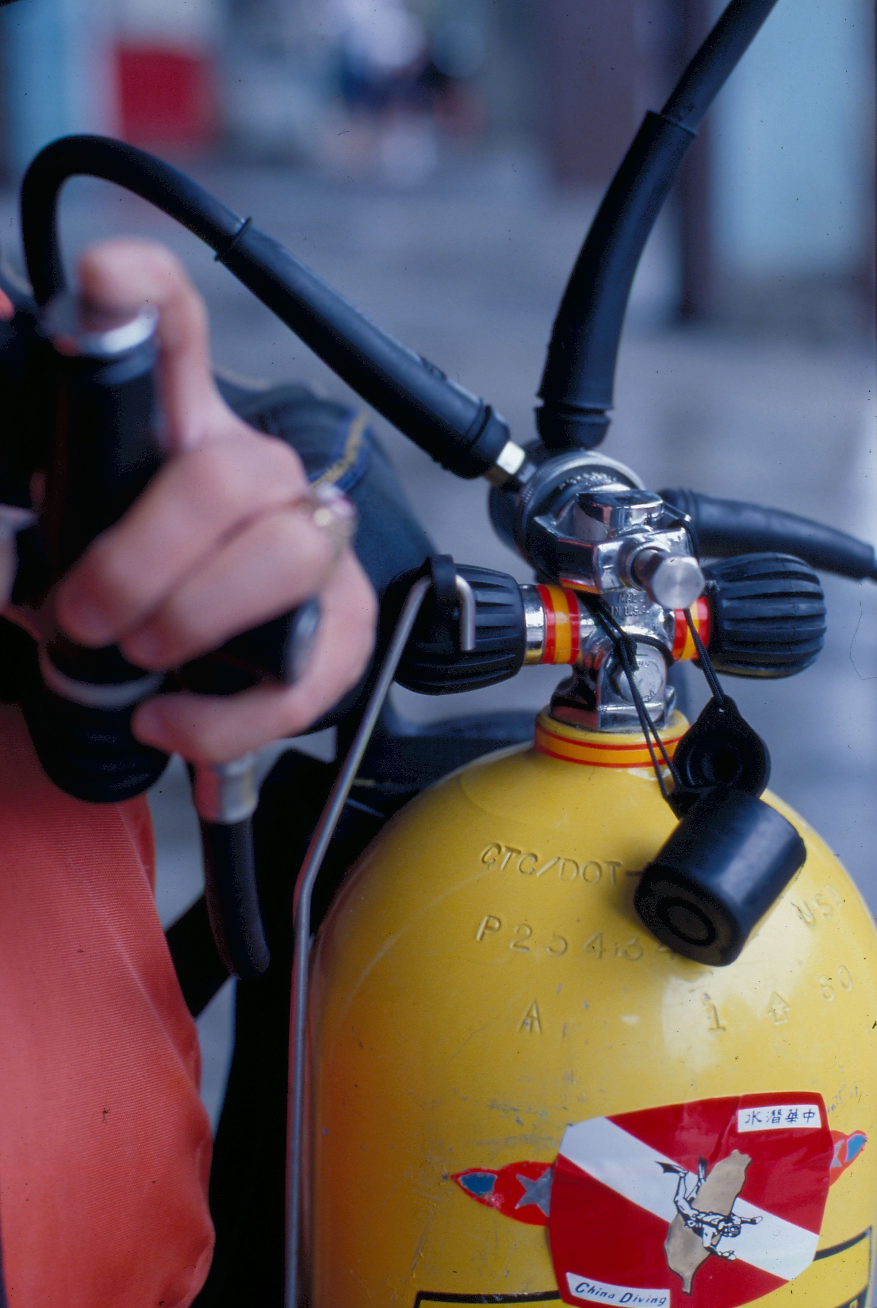 圖4.5:潛水需要專門的配備,下水前更要先做檢查,以免下水後發生危險。器材零件的維護也是謝新曦研究的重點,圖4.的氣瓶保護蓋。(謝新曦/鐘永和)