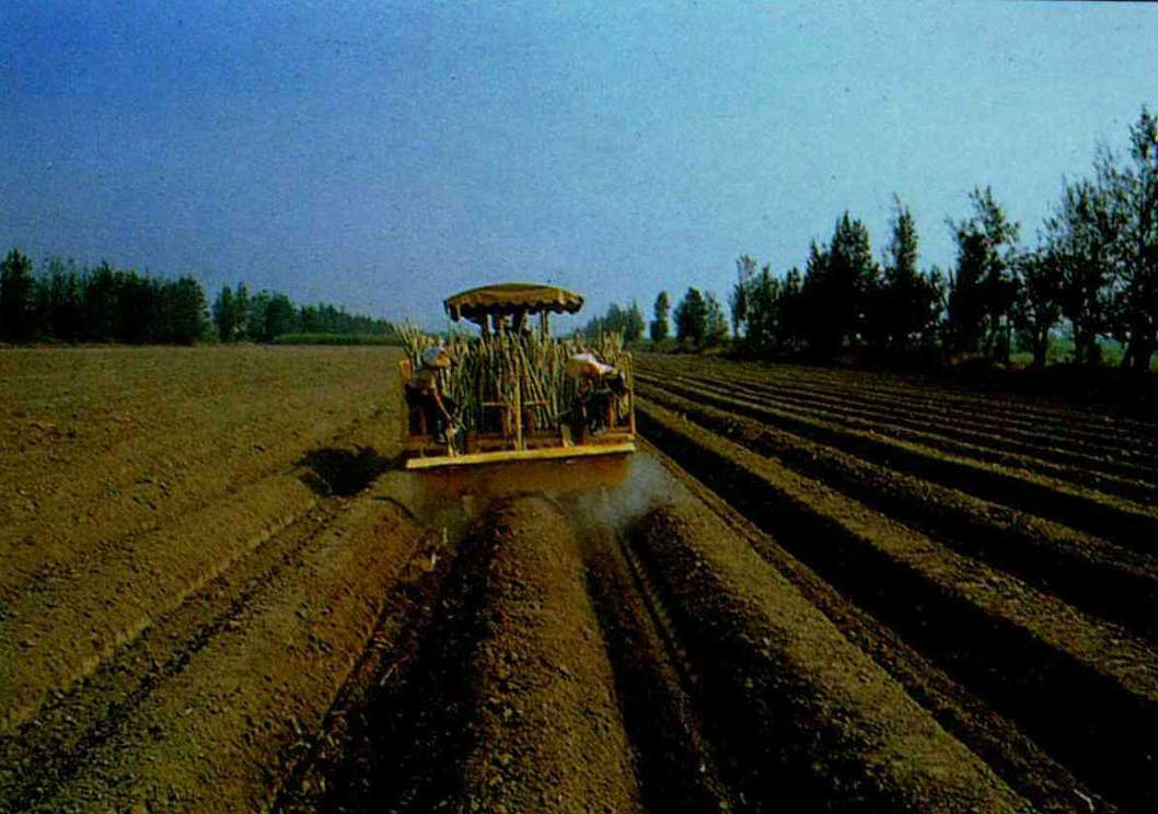 圖為以全莖苗栽植甘蔗的情形。(台灣糖業研究所提供)