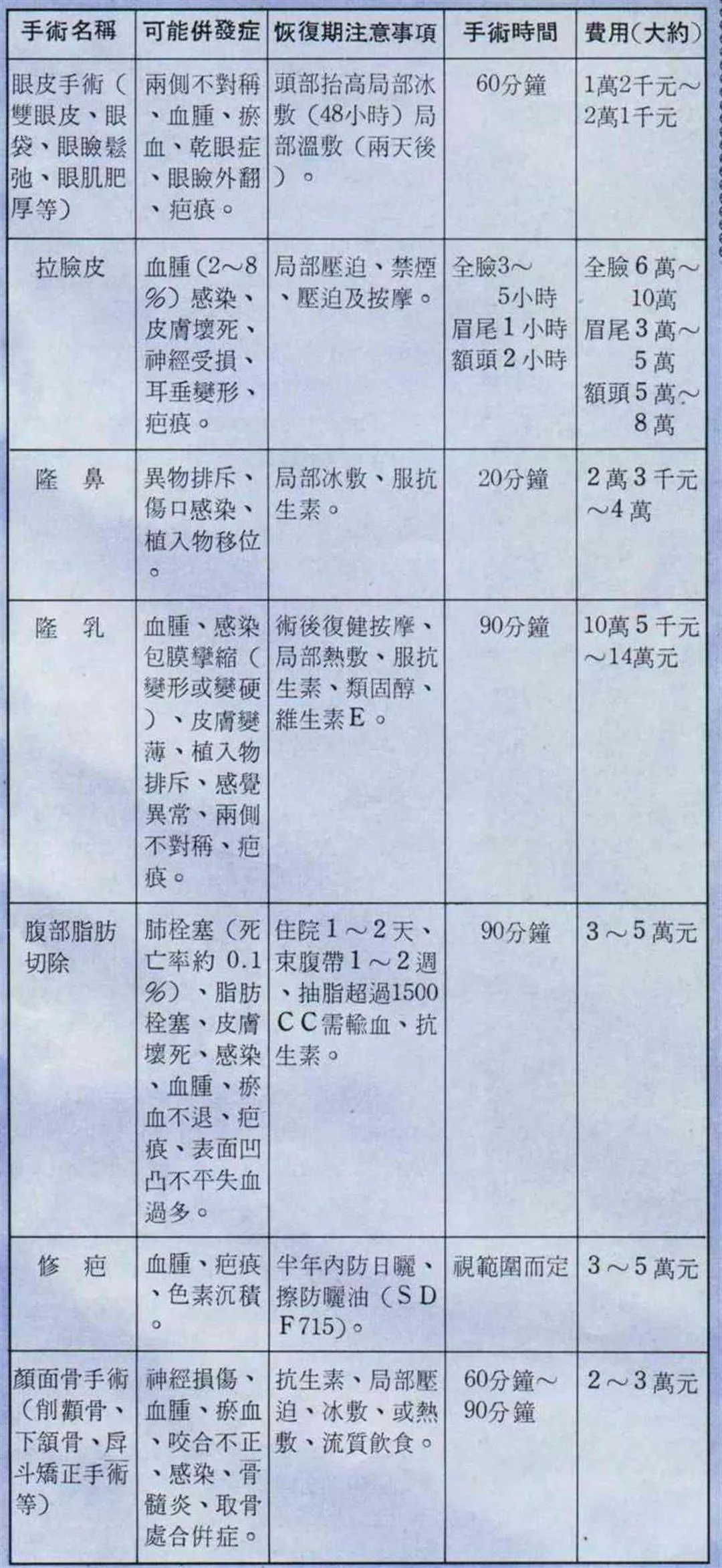 四十出頭、在高中教書的黃老師也有著相同的困擾。去年她做拉皮手術,後來發現左眼上方拉得太緊,有點「吊梢」,為此只好再去做眼皮整形。有些患者三、五年內動過大大小小、不下五次的美容手術,倒不是自己「上癮」,而是每次都有多多少少的不完美,一不做二不休,只好一次次忍受挨刀之苦。